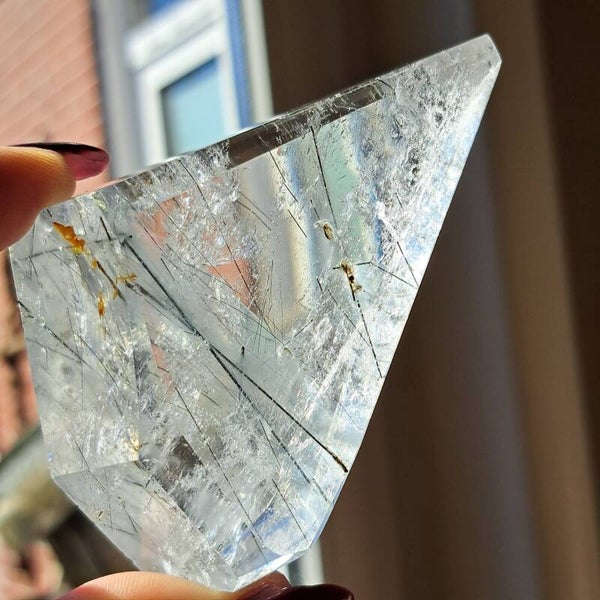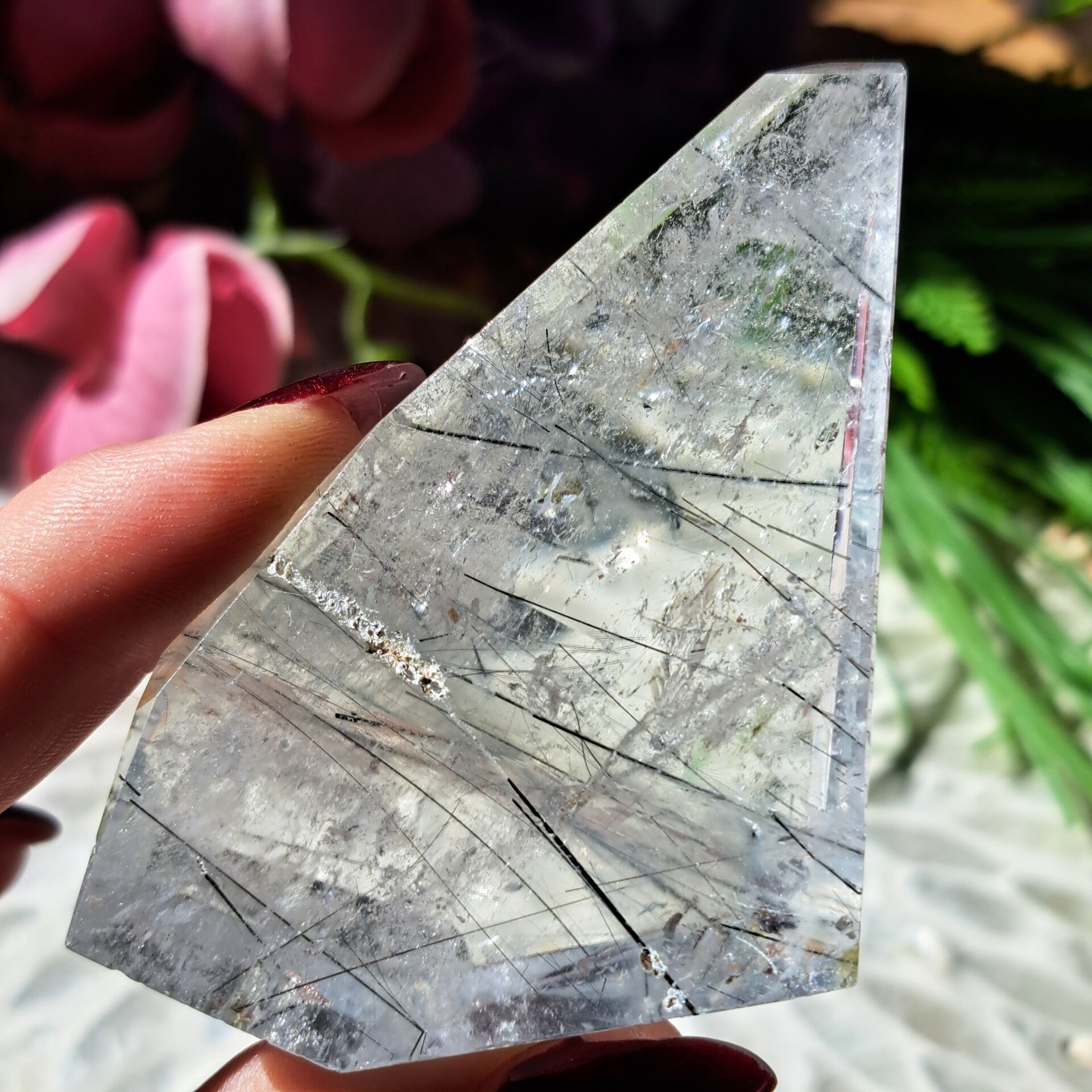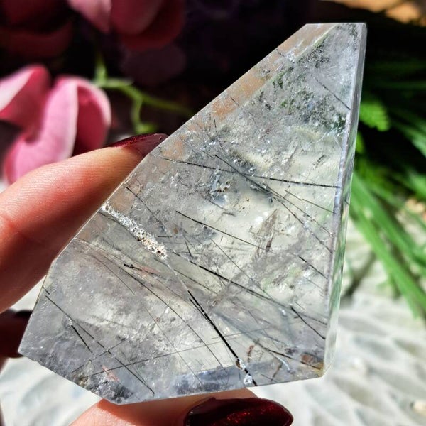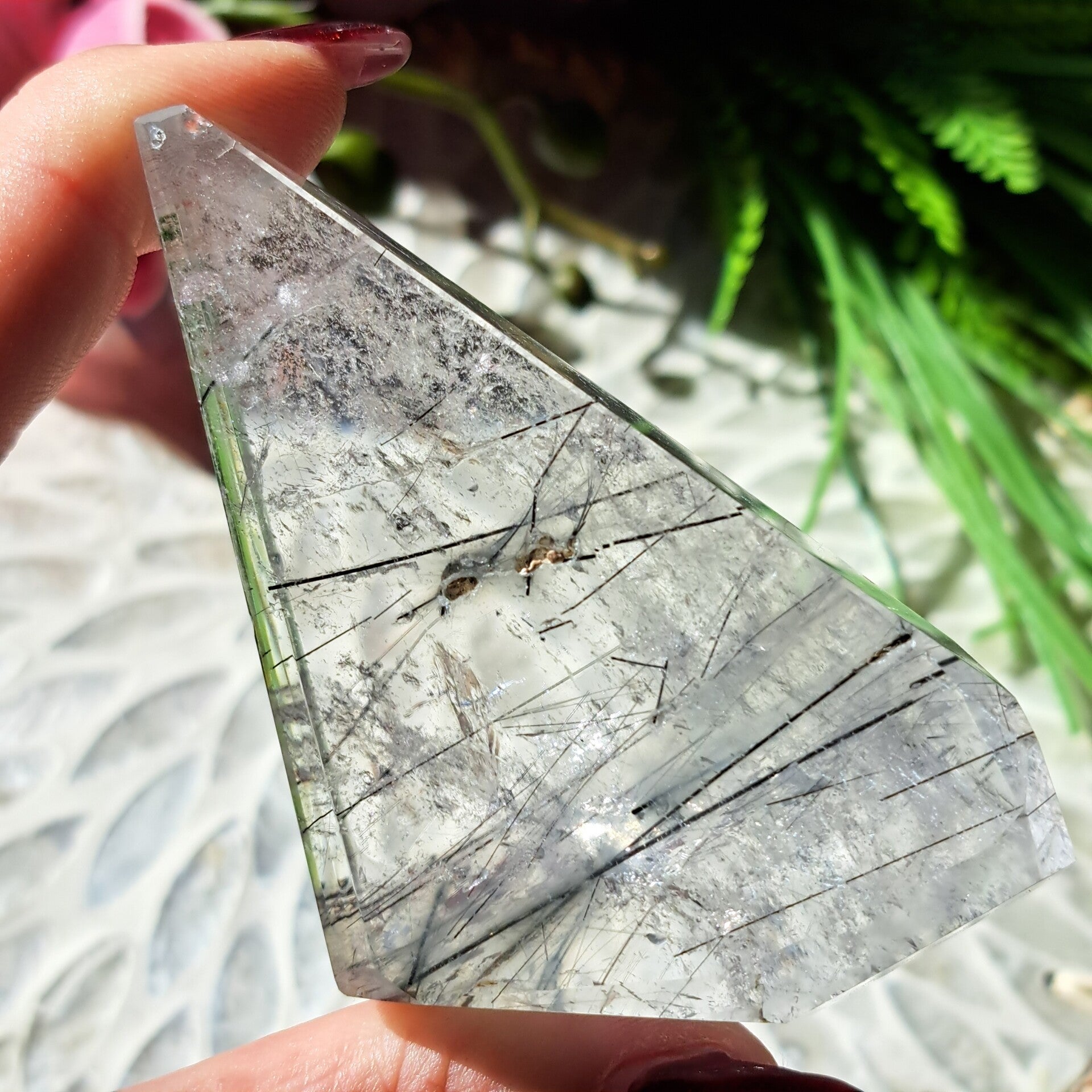 Dit gave sculptuur met zwarte naalden in heldere kwarts is 168 gram en 9 cm groot.