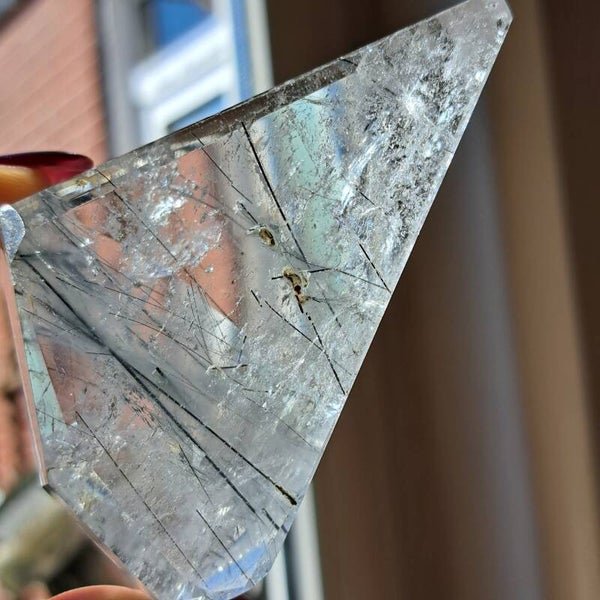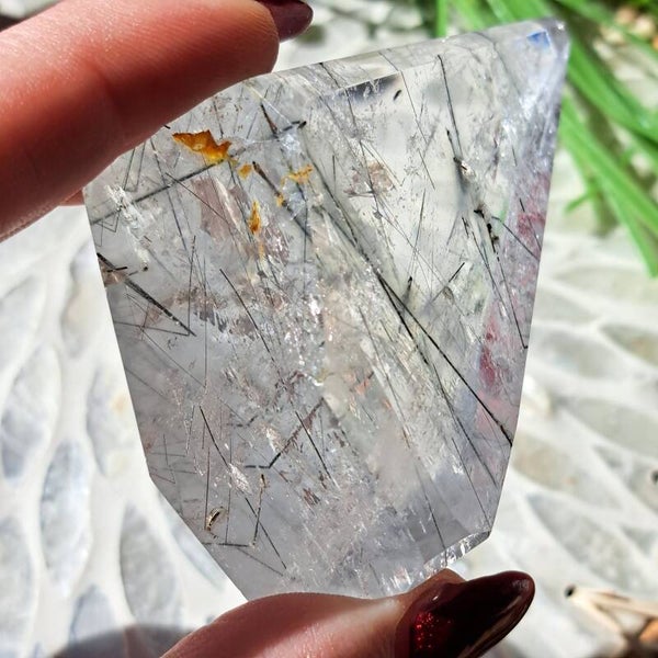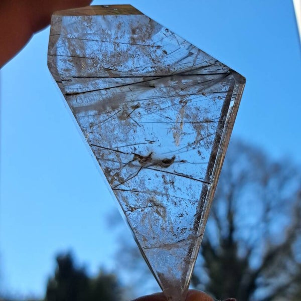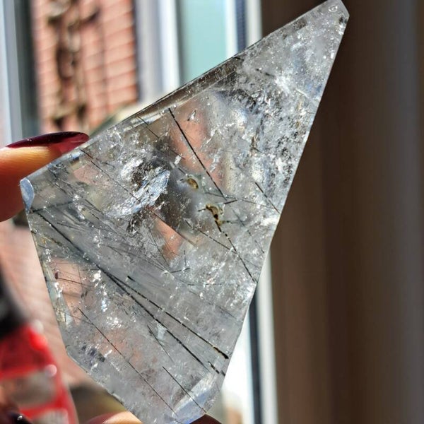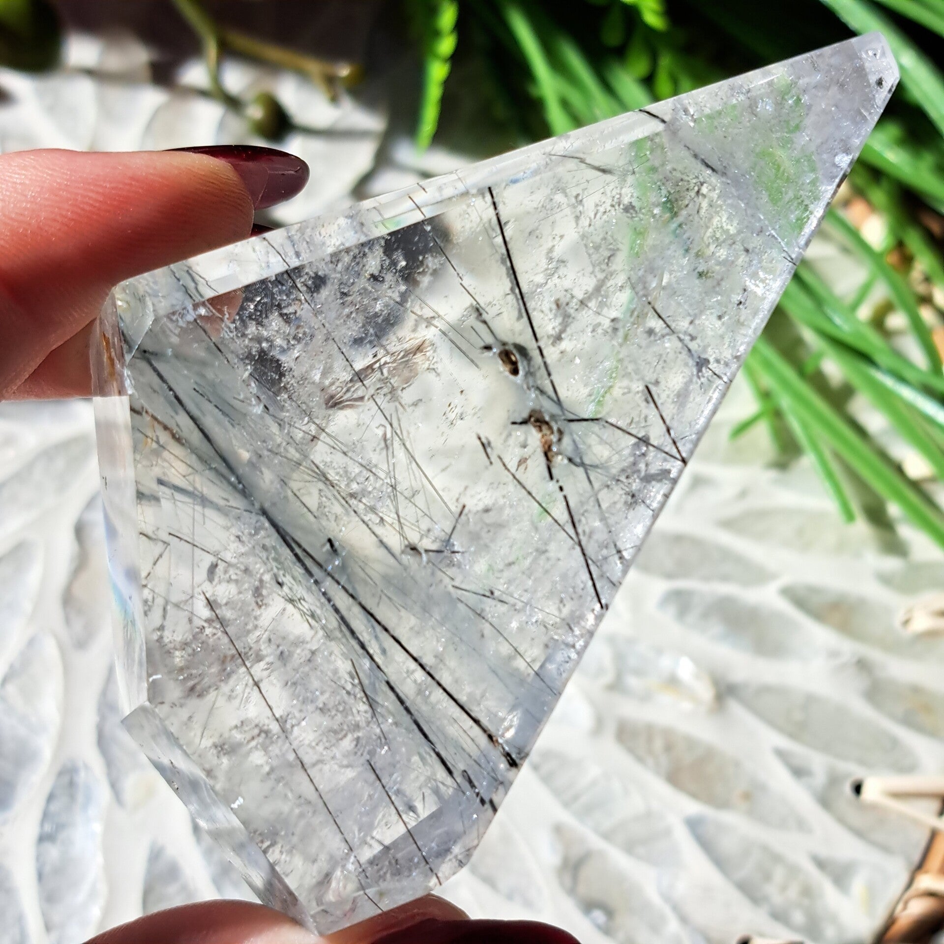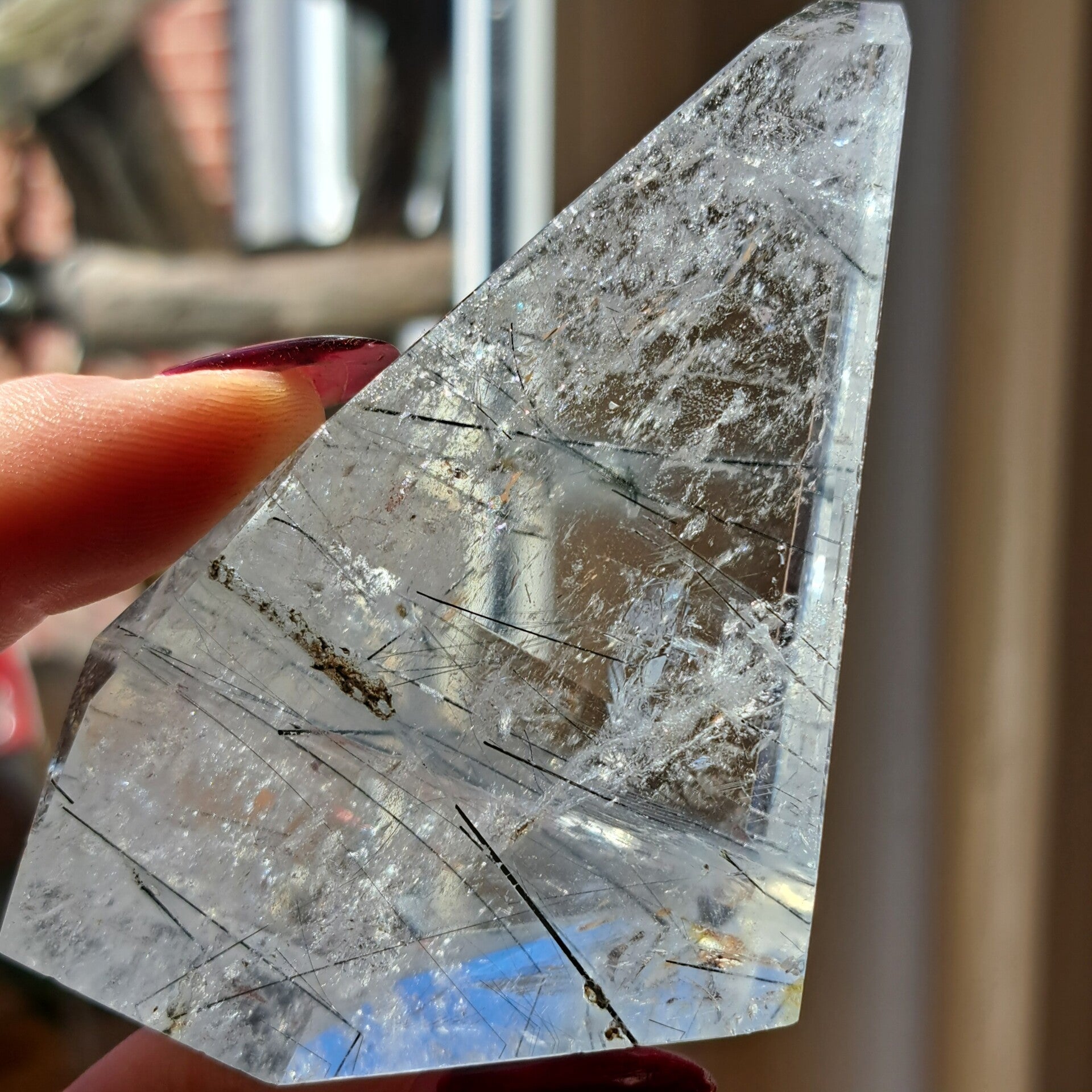 Dit gave sculptuur met zwarte naalden in heldere kwarts is 168 gram en 9 cm groot.