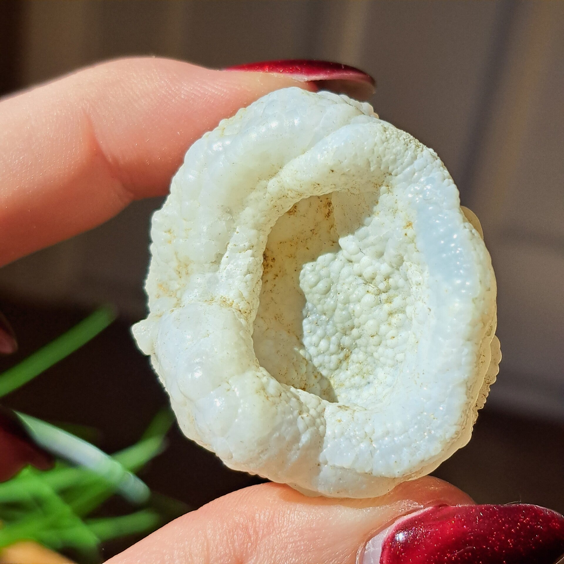 Deze bijzondere soort van Witte Chalcedoon is een geode in beginstadium van de groei, alleen de pure binnenkant is zichtbaar. Er zit nog geen schil/korst omheen gegroeid en deze soort van chalcedoon staat voor puurheid, onschuld als van een kind.
