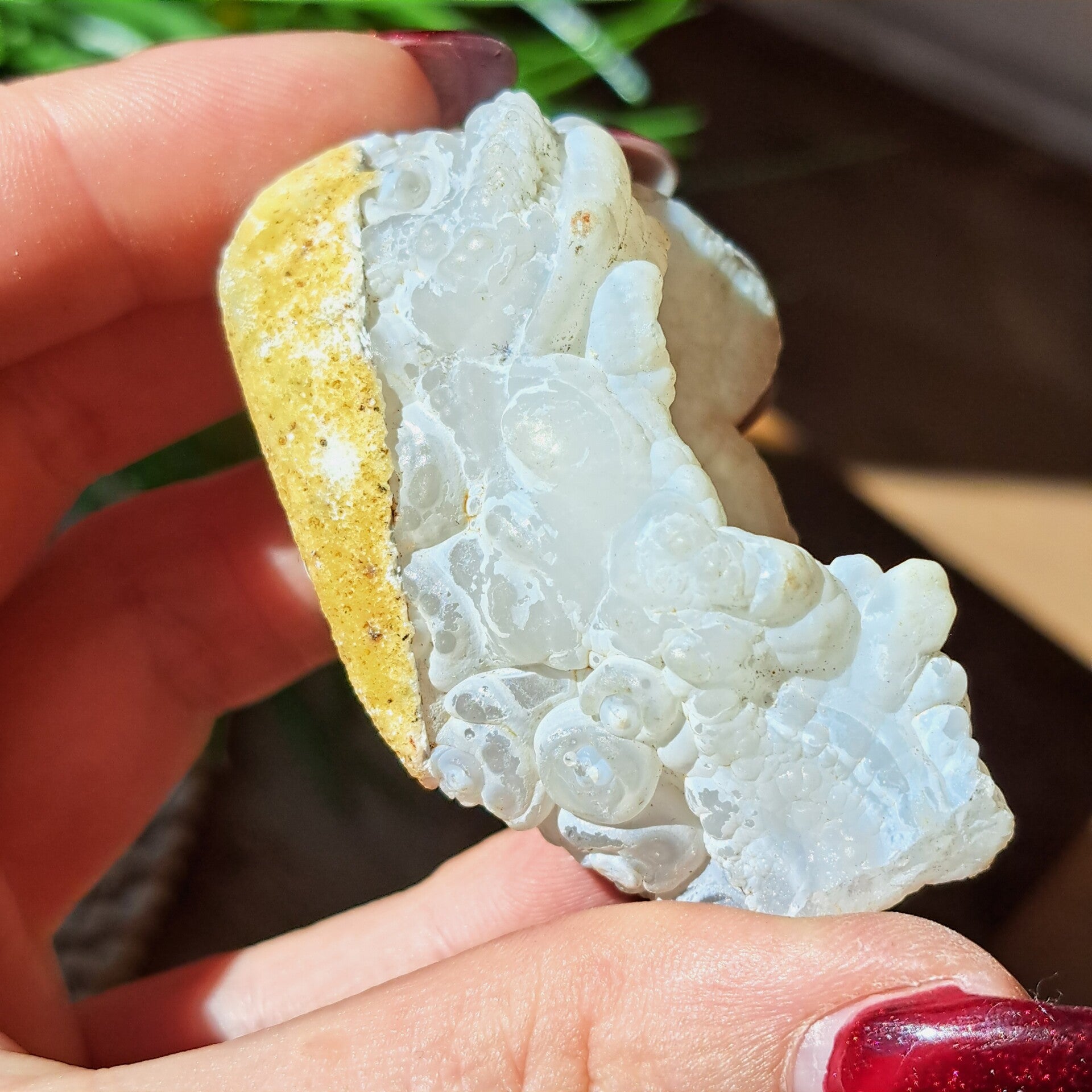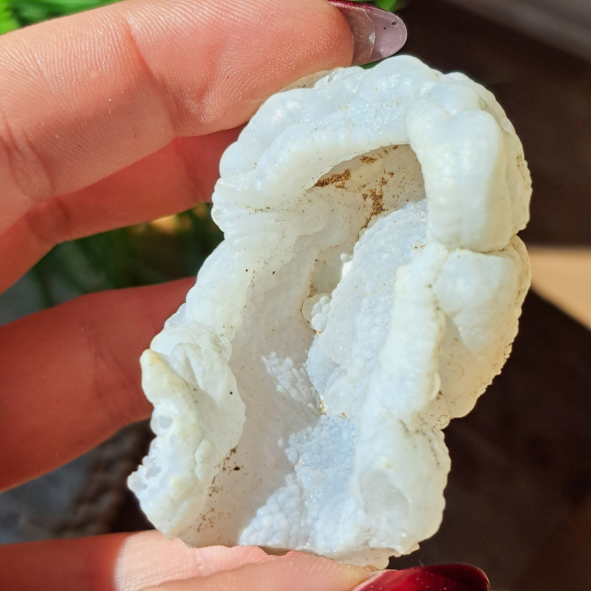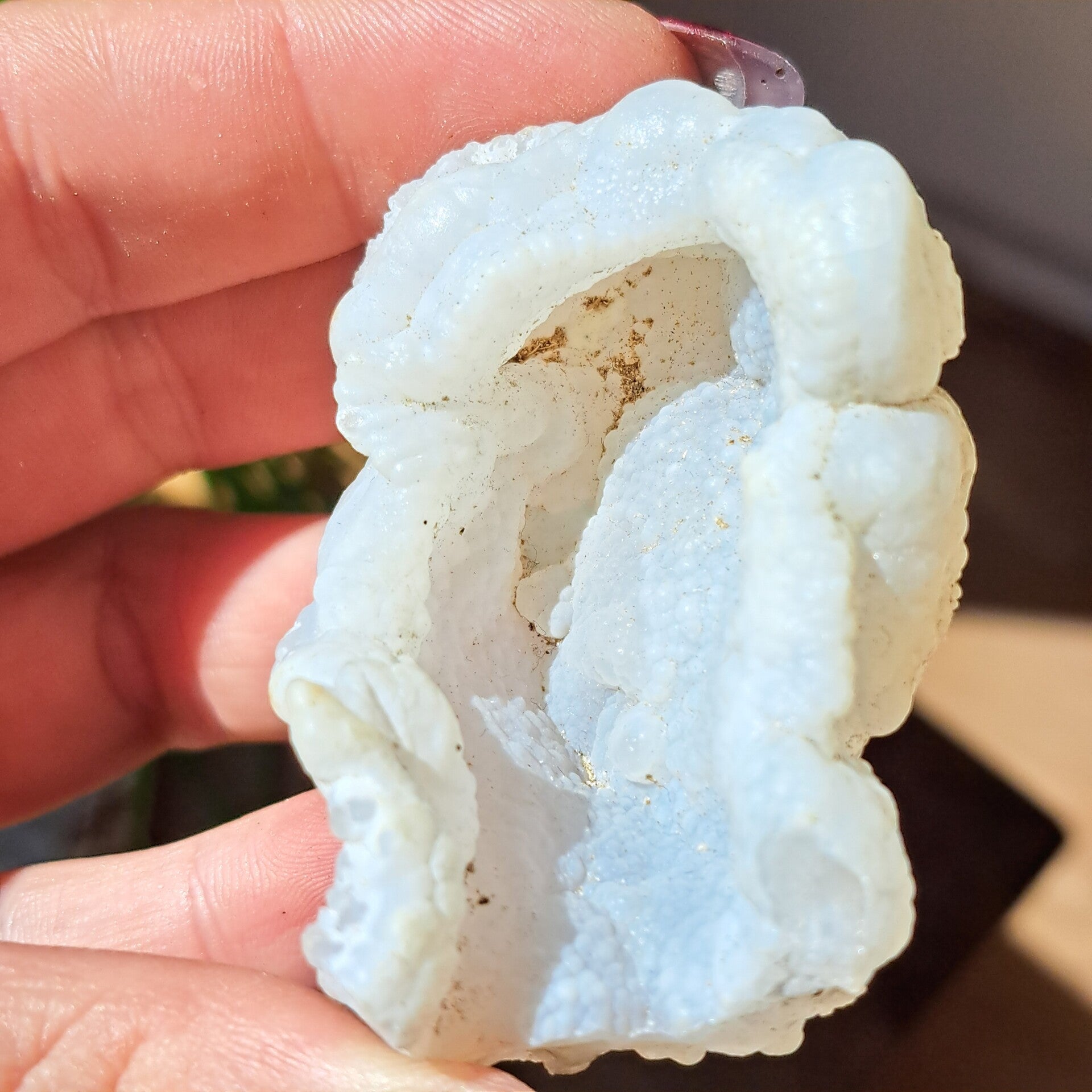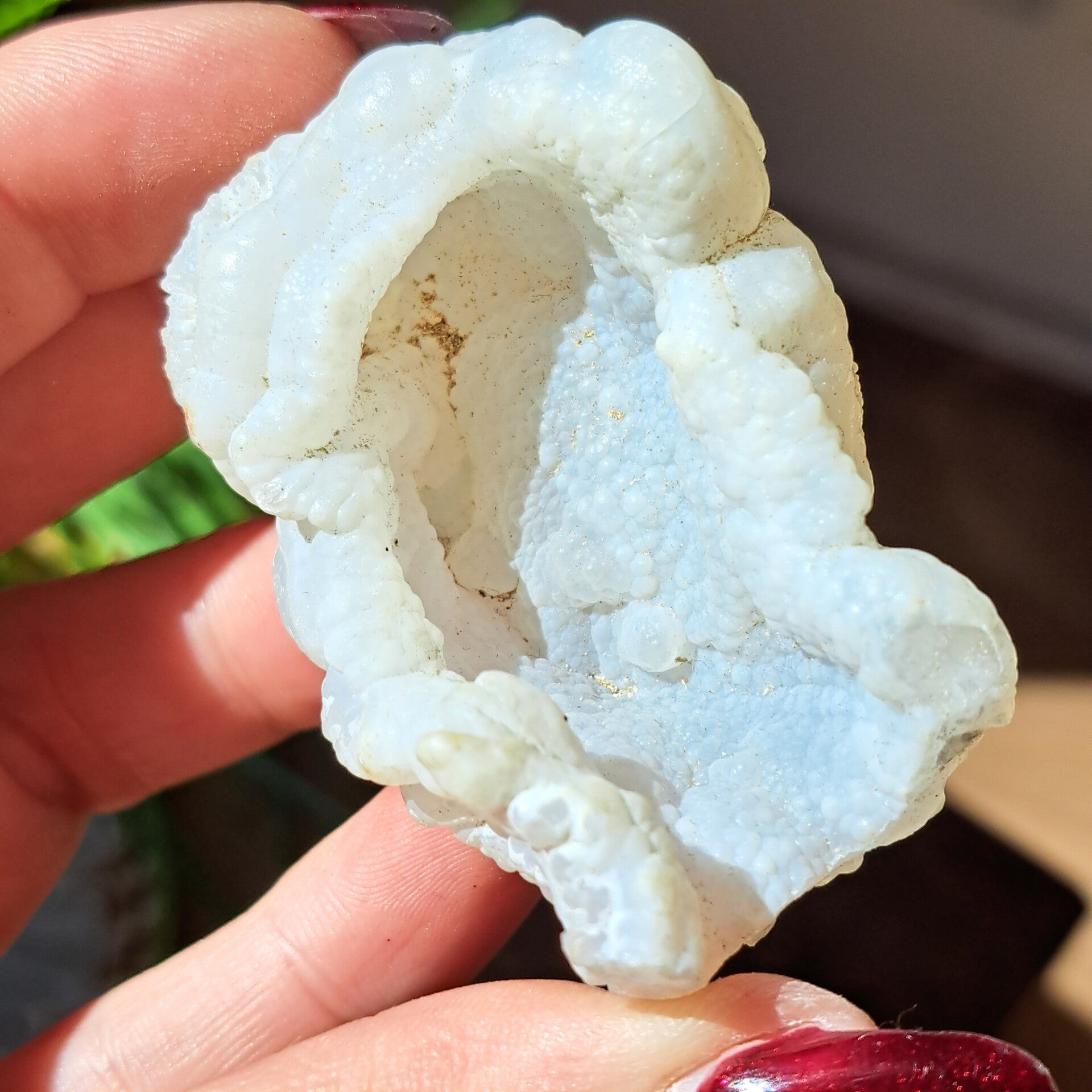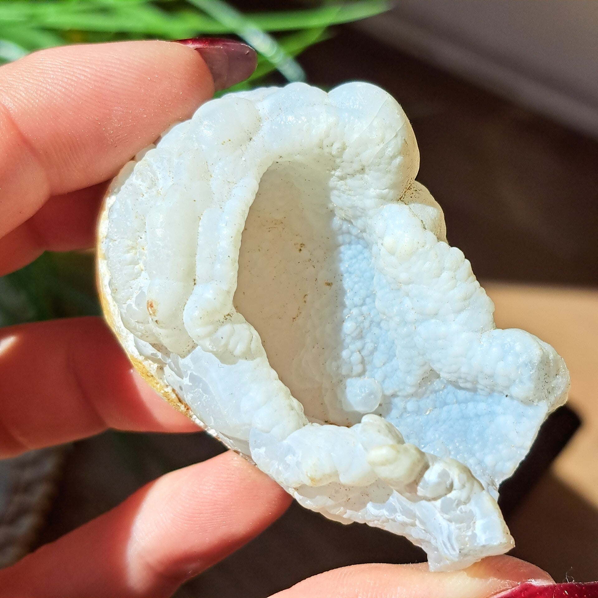 Deze bijzondere soort van Witte Chalcedoon is een geode in beginstadium van de groei, alleen de pure binnenkant is zichtbaar. Er zit nog geen schil/korst omheen gegroeid en deze soort van chalcedoon staat voor puurheid, onschuld als van een kind.