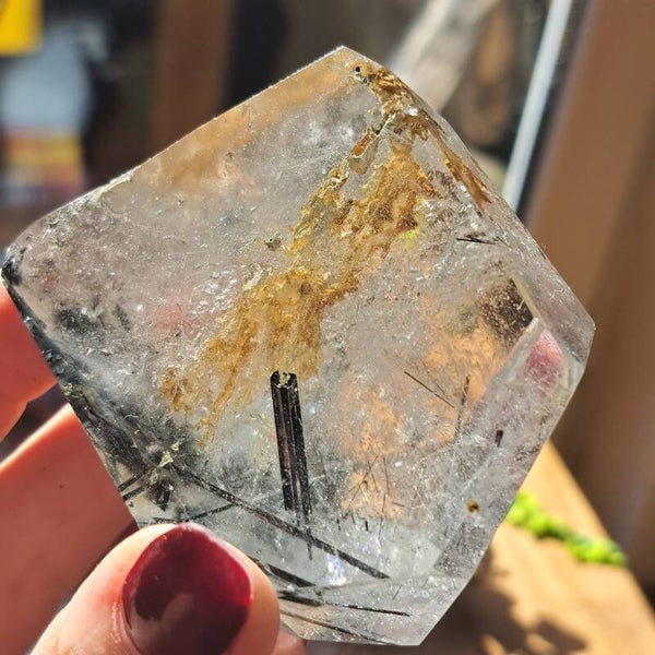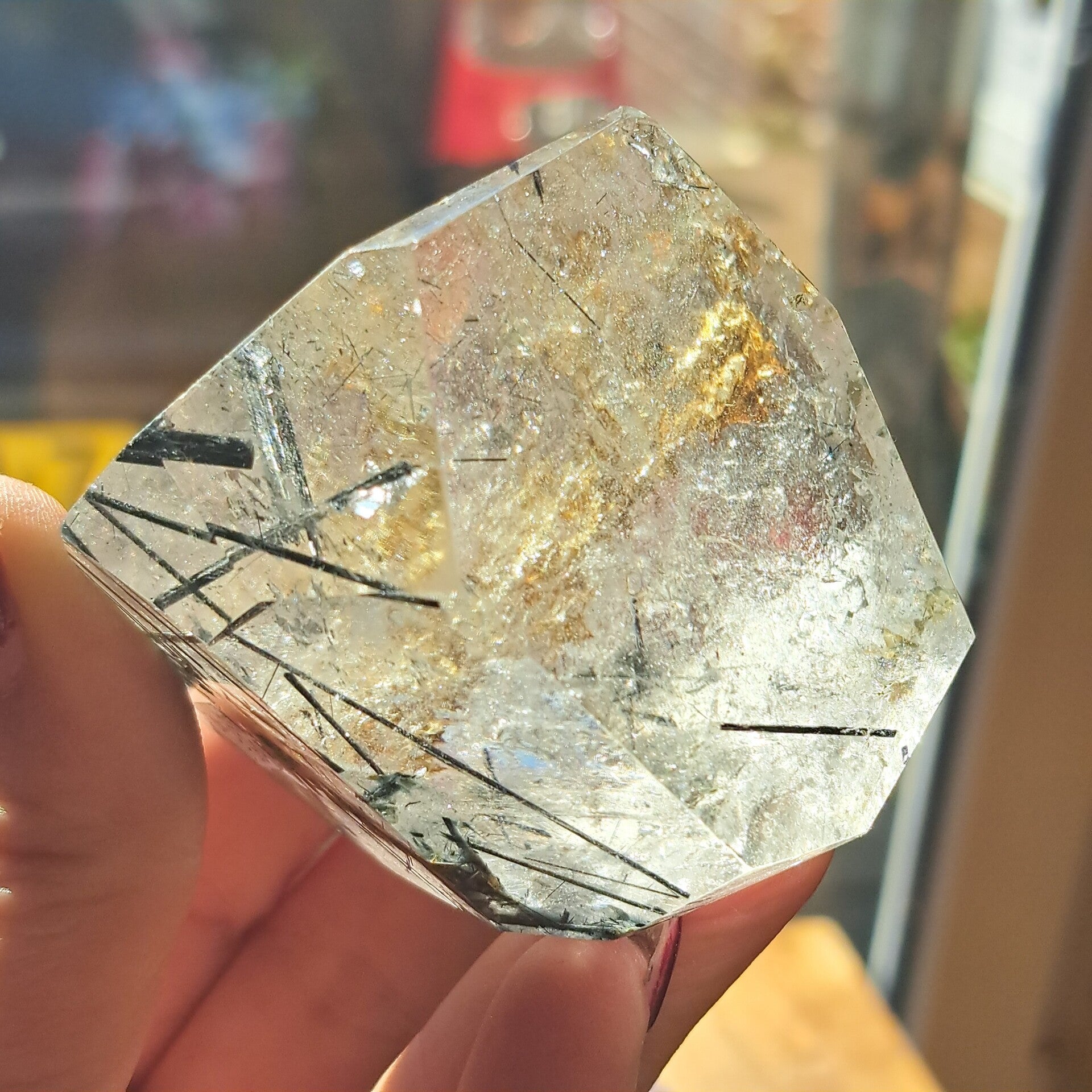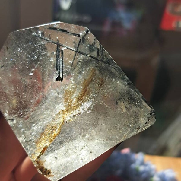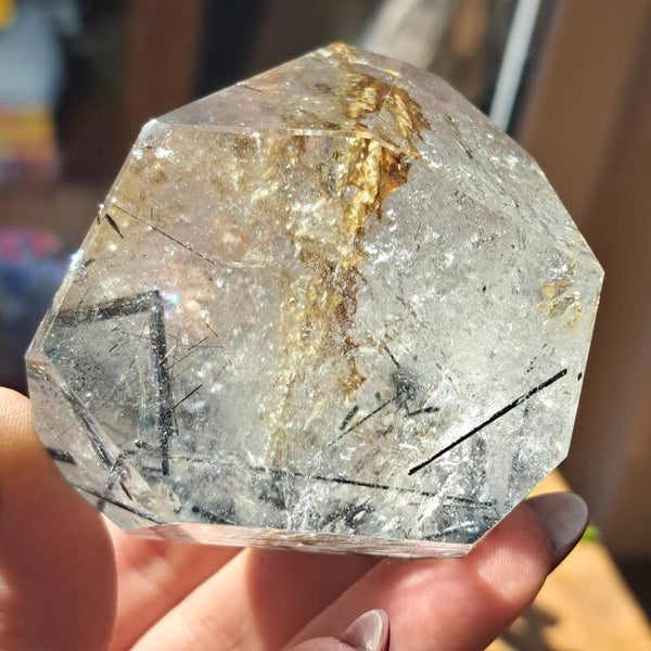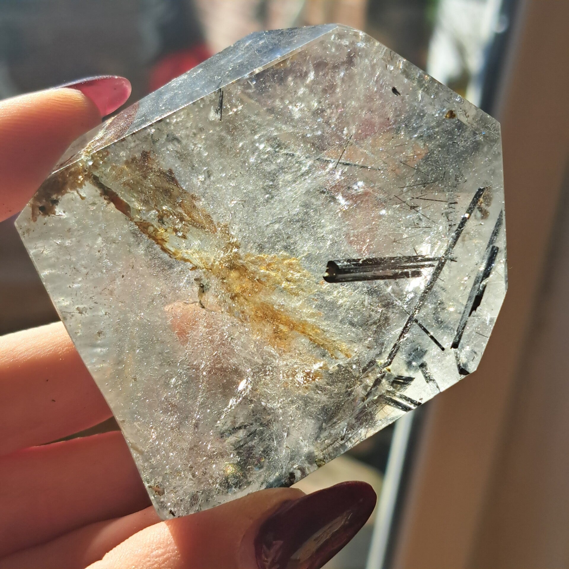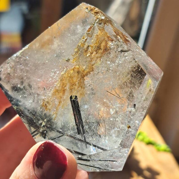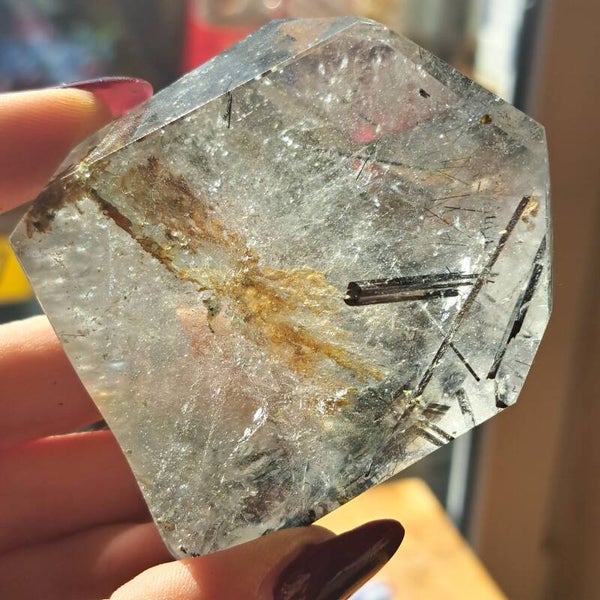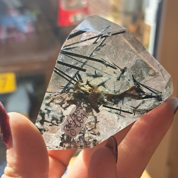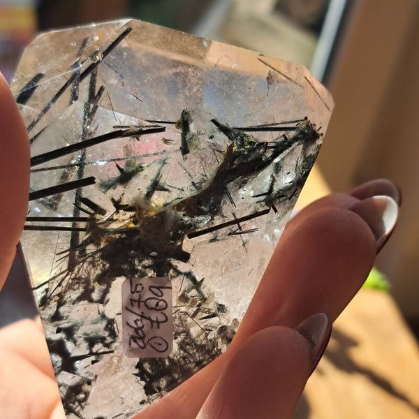 Dit gave heldere sculptuur met zwarte naalden en lodoliet insluitingen is 266 gram en 7,5cm groot.