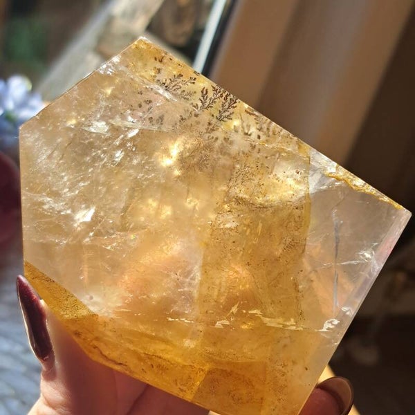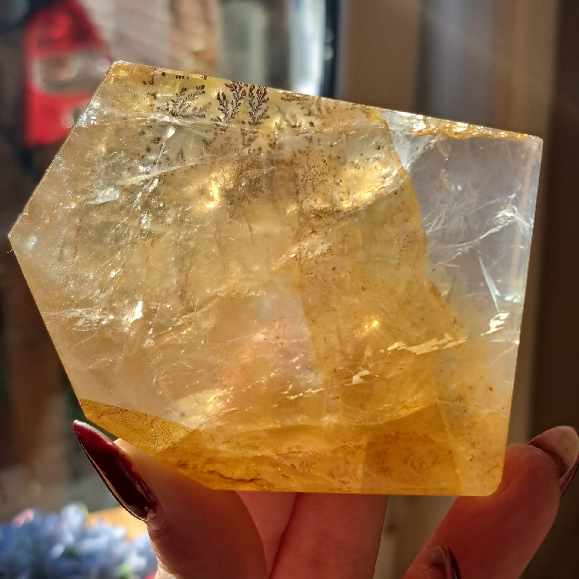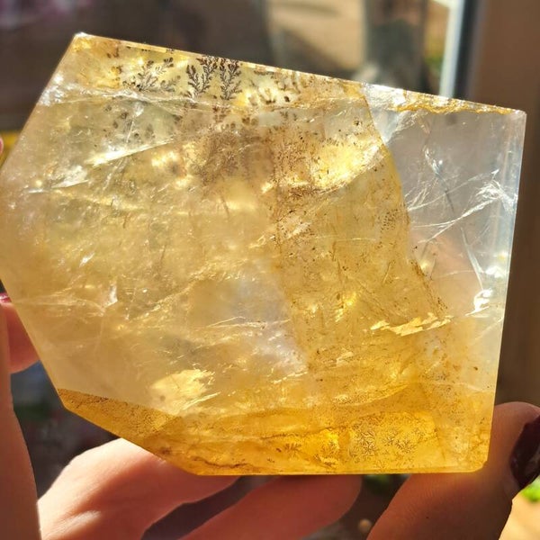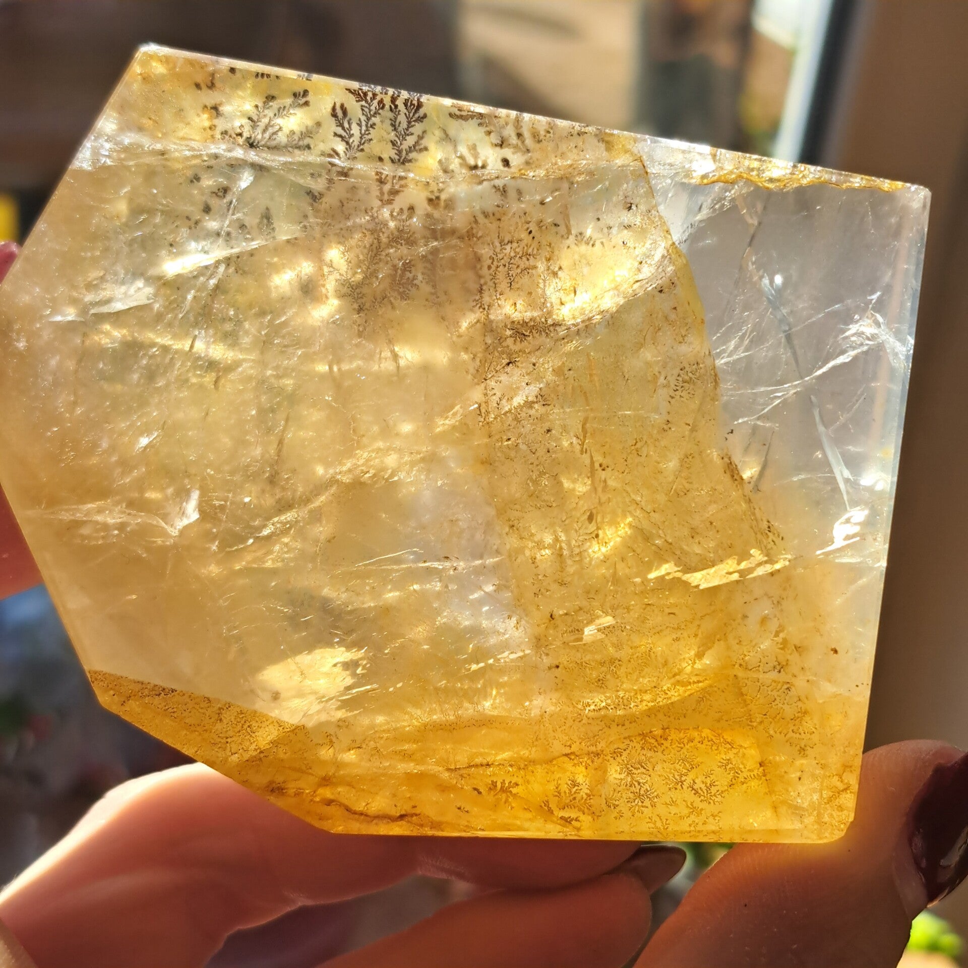 Dit prachtige heldere sculptuur met limoniet en dendriet is 283 gram en 9x7,5 cm groot.