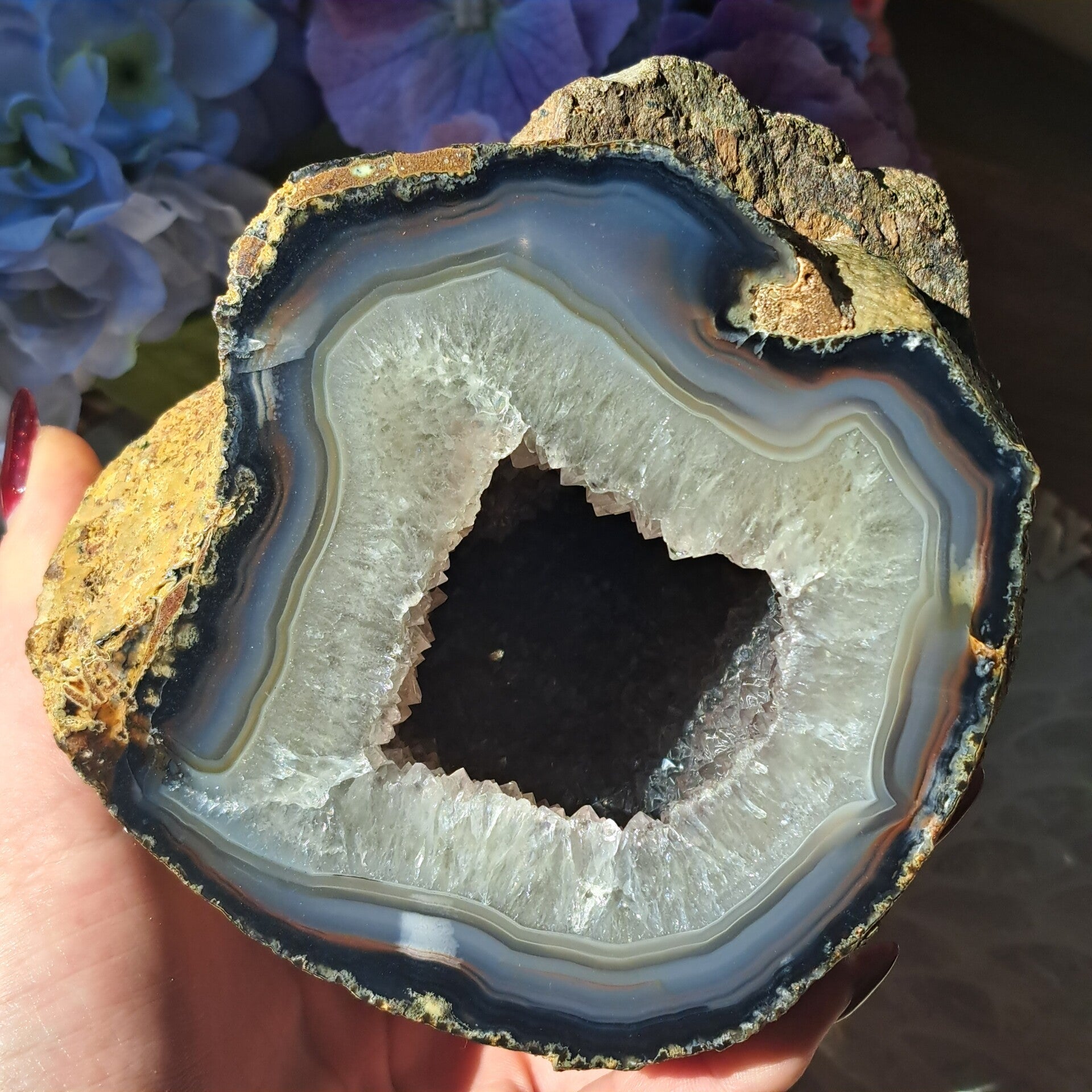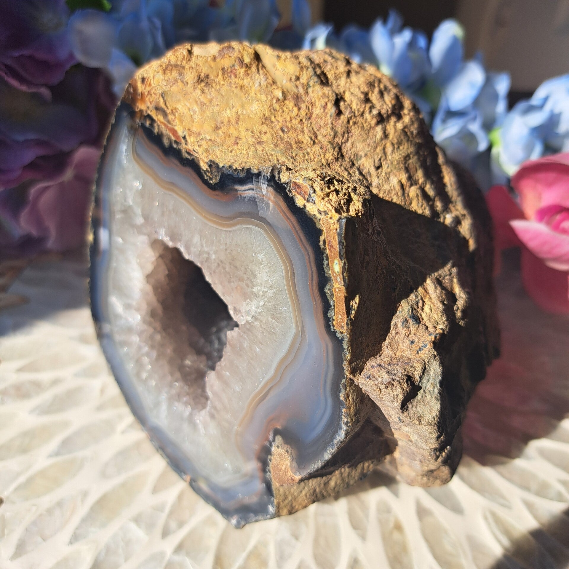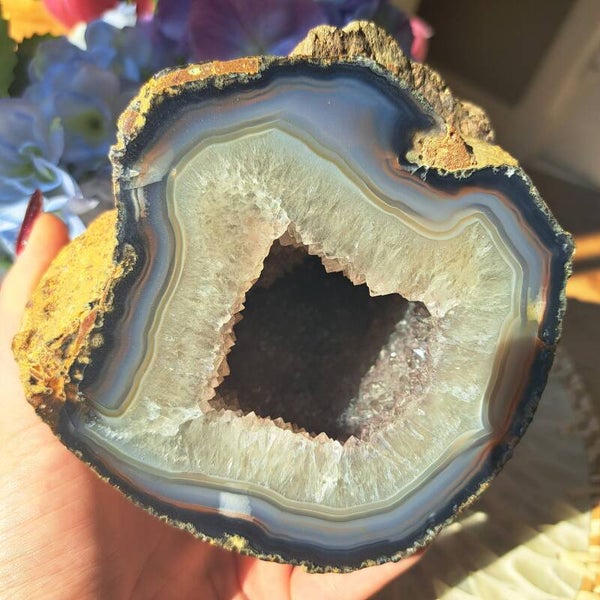 Deze gave agaat geode uit Duitsland met natuurlijke kleuren en vol met kristal aan de binnenzijde is 1883gram en 13x11,5cm groot.