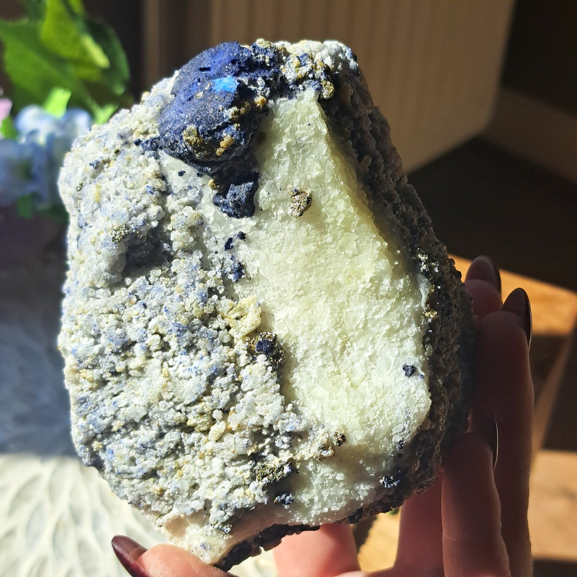 Dit bijzonder mooie stuk Lazuriet met wat pyriet uit Ladjuar Medam, Sar-e-Sang, Kuran wa Munjan District uit Afghanistan is 1248 gram en 12cm groot.