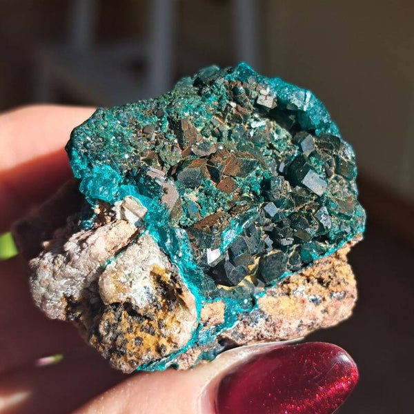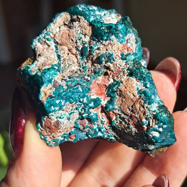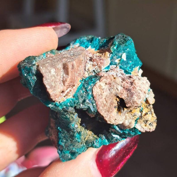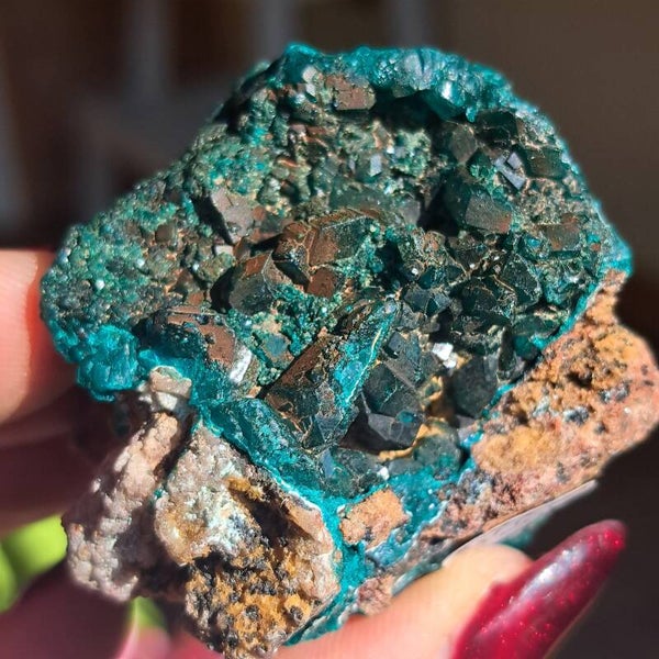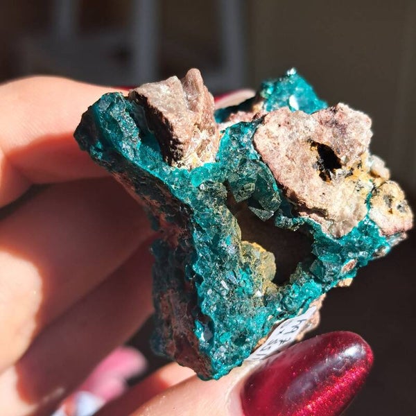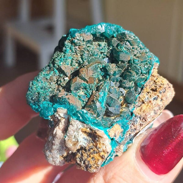Dit toffe ruwe stuk heeft prachtige heldere groenen kristallen. Ze komt uit DR Congo en is 71 gram en 5x5,5cm groot.