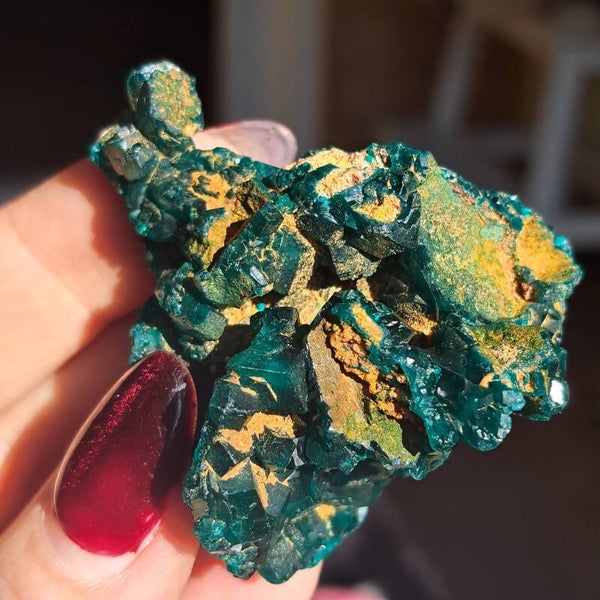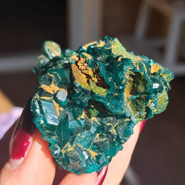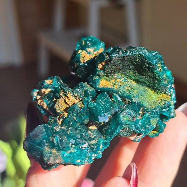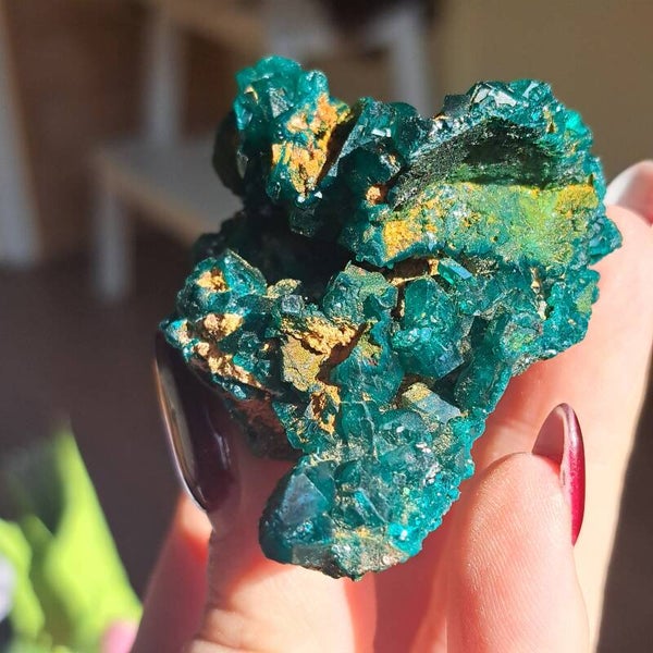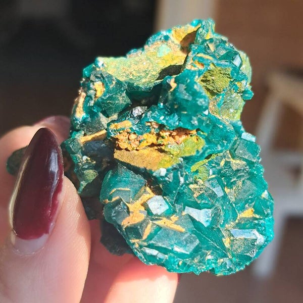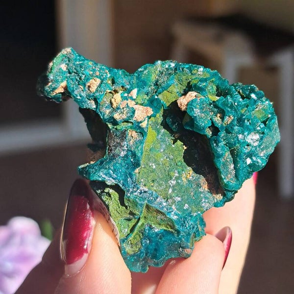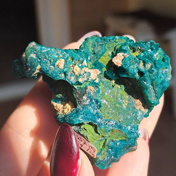 Dit toffe ruwe stuk heeft prachtige heldere groene kristallen. Ze komt uit DR Congo en is 61 gram en 5x6cm groot.