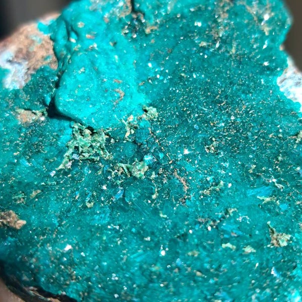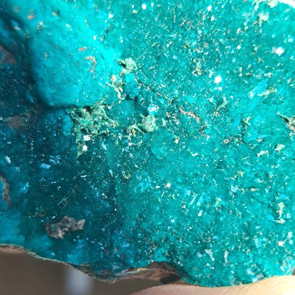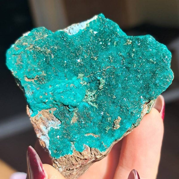 Dit toffe ruwe stuk heeft prachtige heldere groenen kristallen. Ze komt uit DR Congo en is 864gram en 6x5,5cm groot.
