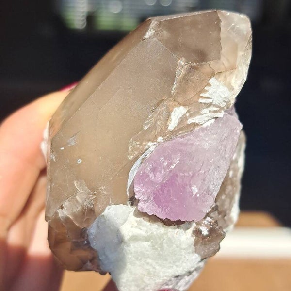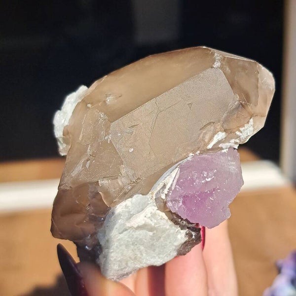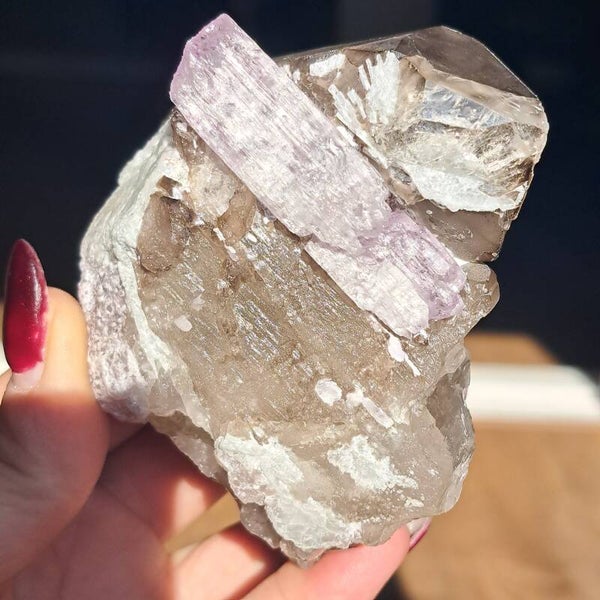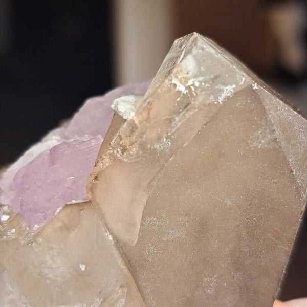 Dit prachtige ruwe cluster met groot roze Kunziet kristal in natuurlijke rookkwarts dubbelpunter (Vol kristalgroei) en heeft wat paarse Mica/ Lepidoliet insluiting.