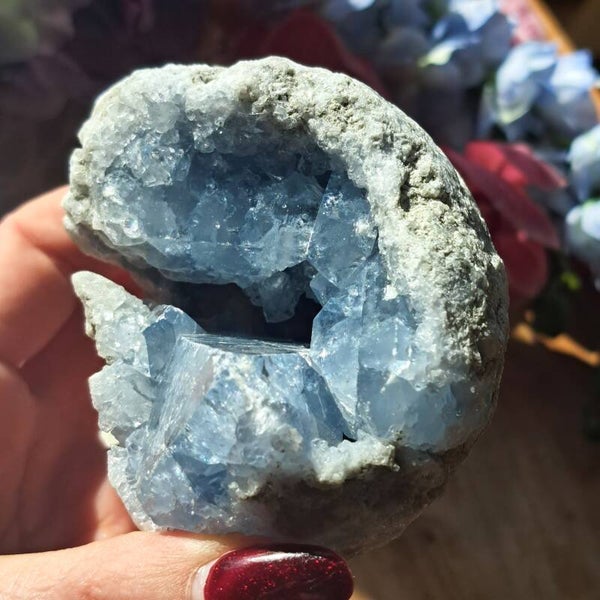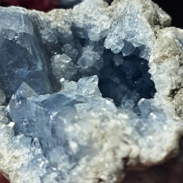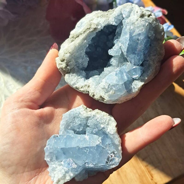 Deze Celestien Geode komt uit Madagaskar en is 546 gram en is 11 cm groot, is in twee gedeeltes en passen op elkaar. Aan de binnenzijde zowel kleine als grote mooie blauwe kristallen.