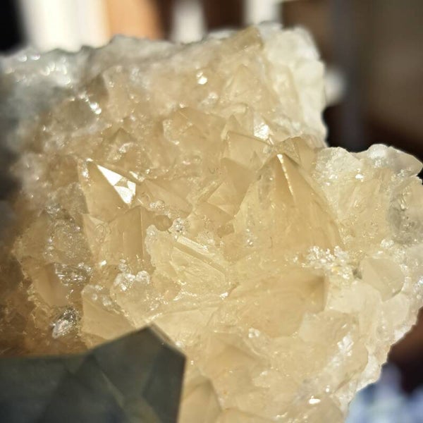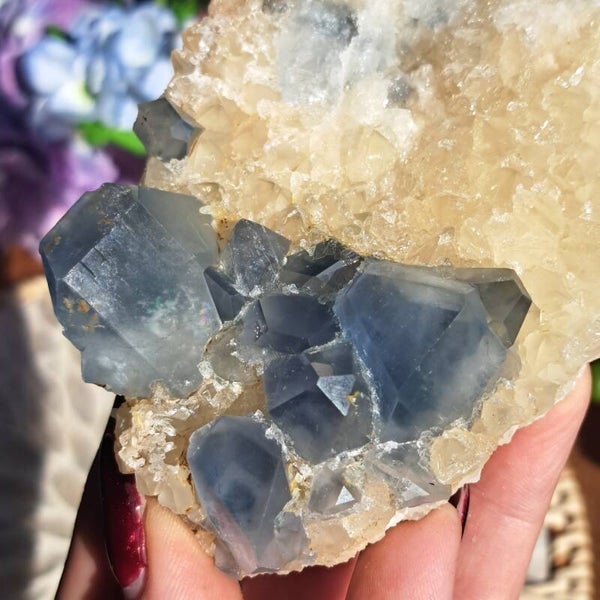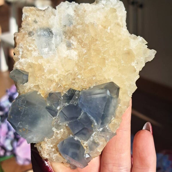 Dit prachtige cluster met Dogtooth Calciet kristallen in combinatie met diepblauwe grote kristallen zorgt voor een prachtig contrast en is een ware aanwinst in je collectie! Dit stuk is 244 gram en is 10x8 cm groot.