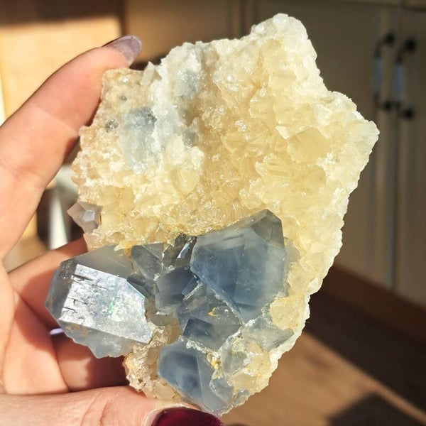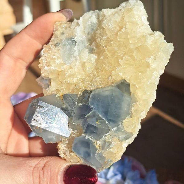 Prachtige vondst van diepblauwe Celestien uit Afghanistan (Dara-i-Laman, Badghis Prov., Afghanistan. Deze vorm van Celestien staat bekend om haar diepblauwe en semi transparante grote kristallen en hiervan komt maar zo heel af en toe iets op de markt.