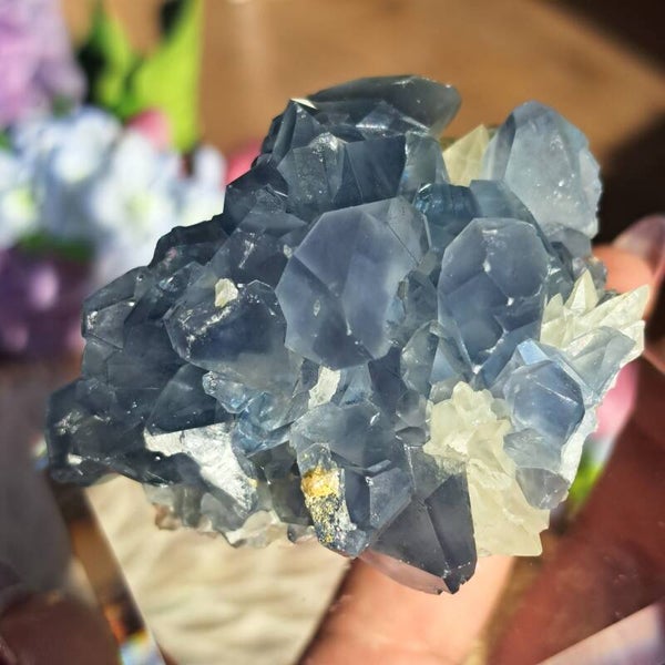 Dit prachtige cluster met diepblauwe grote kristallen is een ware aanwinst in je collectie! Dit stuk is 248 gram en is 7x7 cm groot en komt met een glazen plaatje.