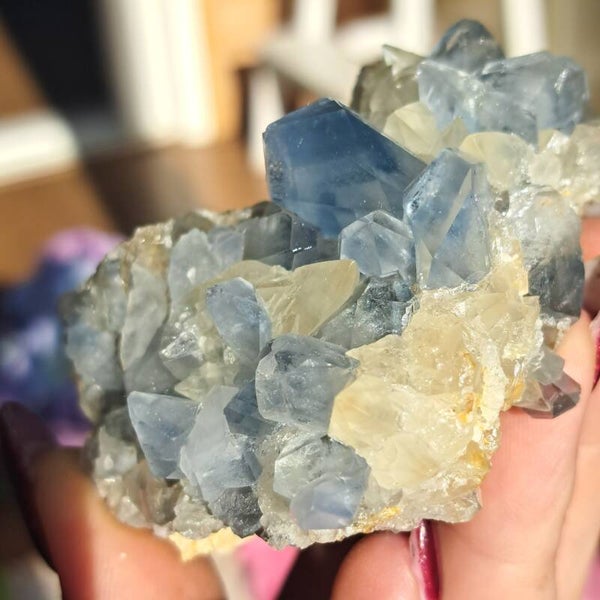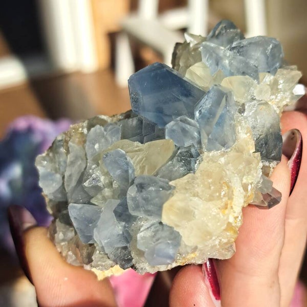 Prachtige vondst van diepblauwe Celestien uit Afghanistan (Dara-i-Laman, Badghis Prov., Afghanistan. Deze vorm van Celestien staat bekend om haar diepblauwe en semi transparante grote kristallen en hiervan komt maar zo heel af en toe iets op de markt.
