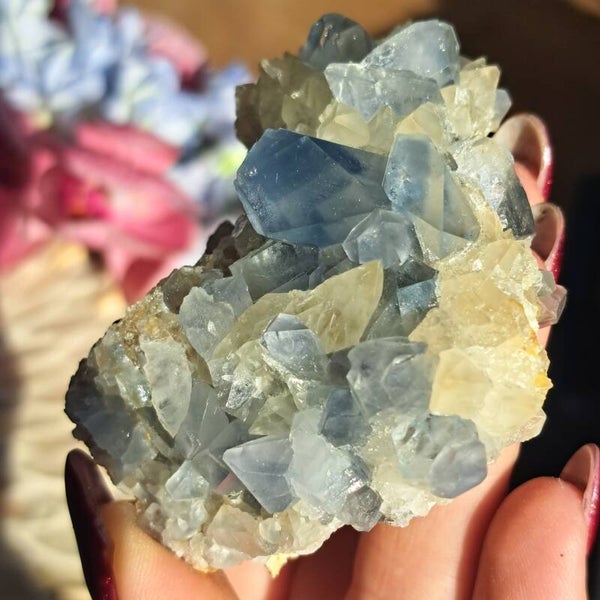 Dit prachtige cluster met Dogtooth Calciet kristallen in combinatie met diepblauwe grote kristallen zorgt voor een prachtig contrast en is een ware aanwinst in je collectie! Dit stuk is 178 gram en is 7x6 cm groot.