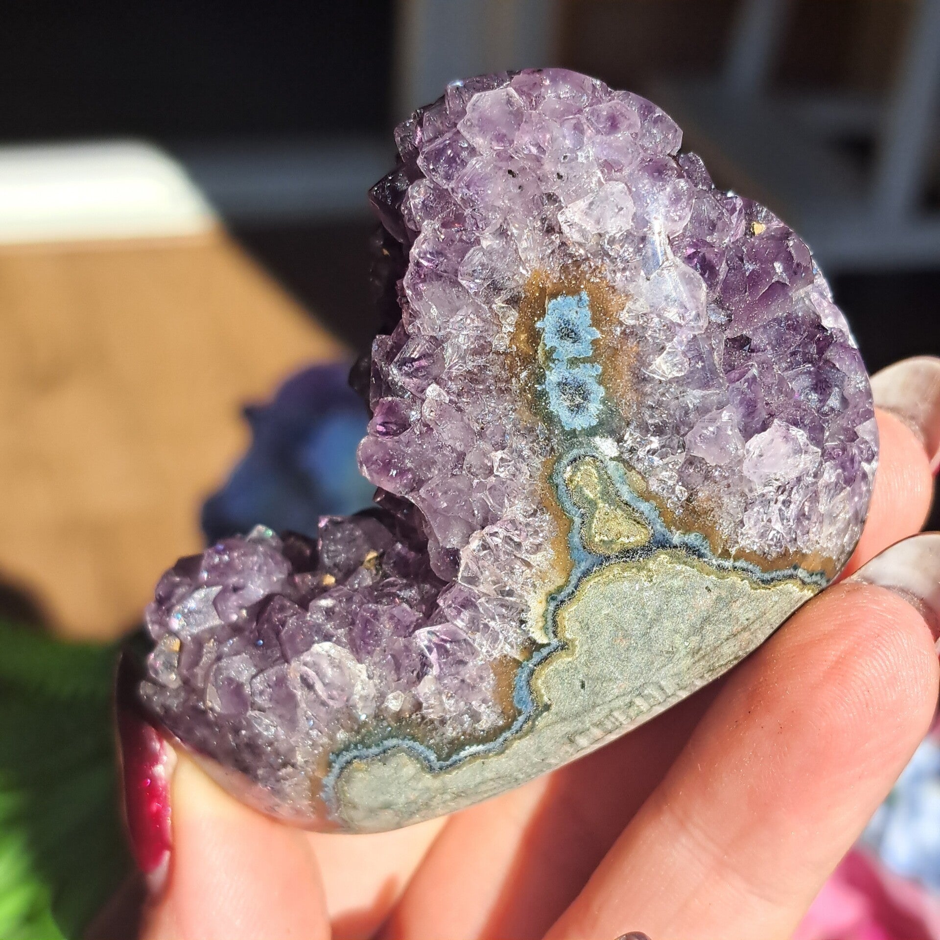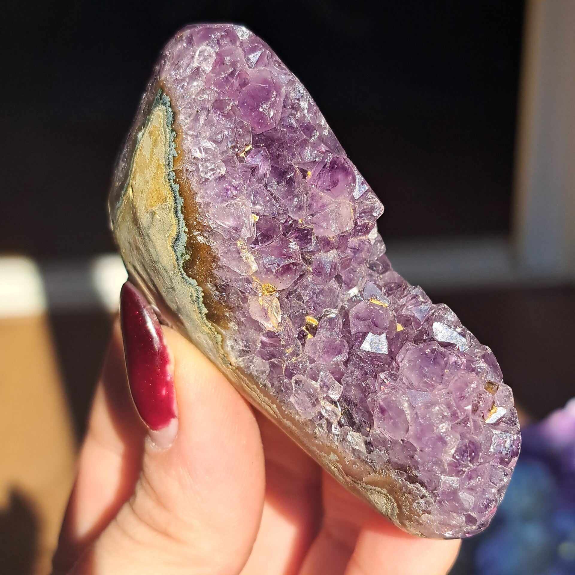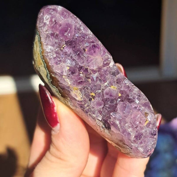 Deze gave gepolijste amethist uit Brazilie is 129 gram en 7cm groot.