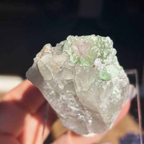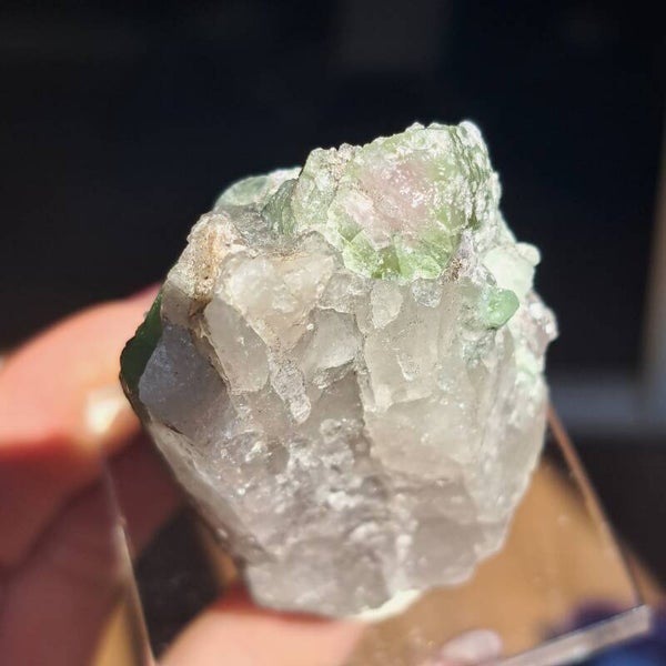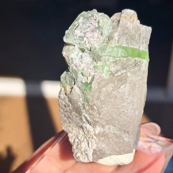 Dit toffe cluster van een combinatie van groene toermalijn (Klein beetje roze) met rookkwarts komt uit het Gilgit District in Pakistan en is totaal 7 cm groot.