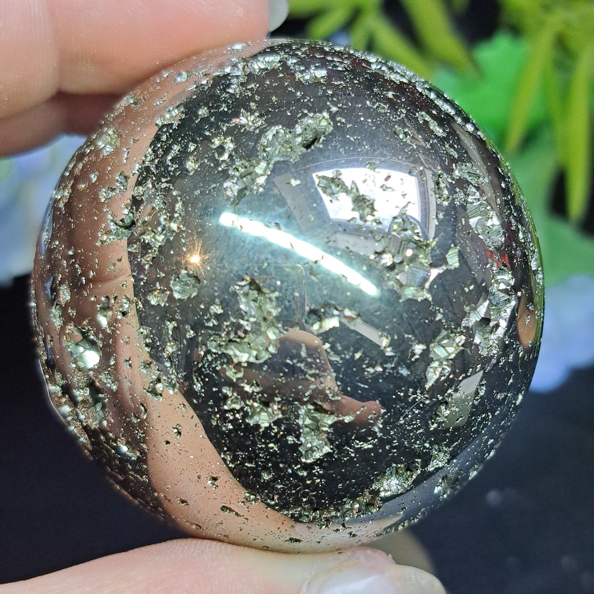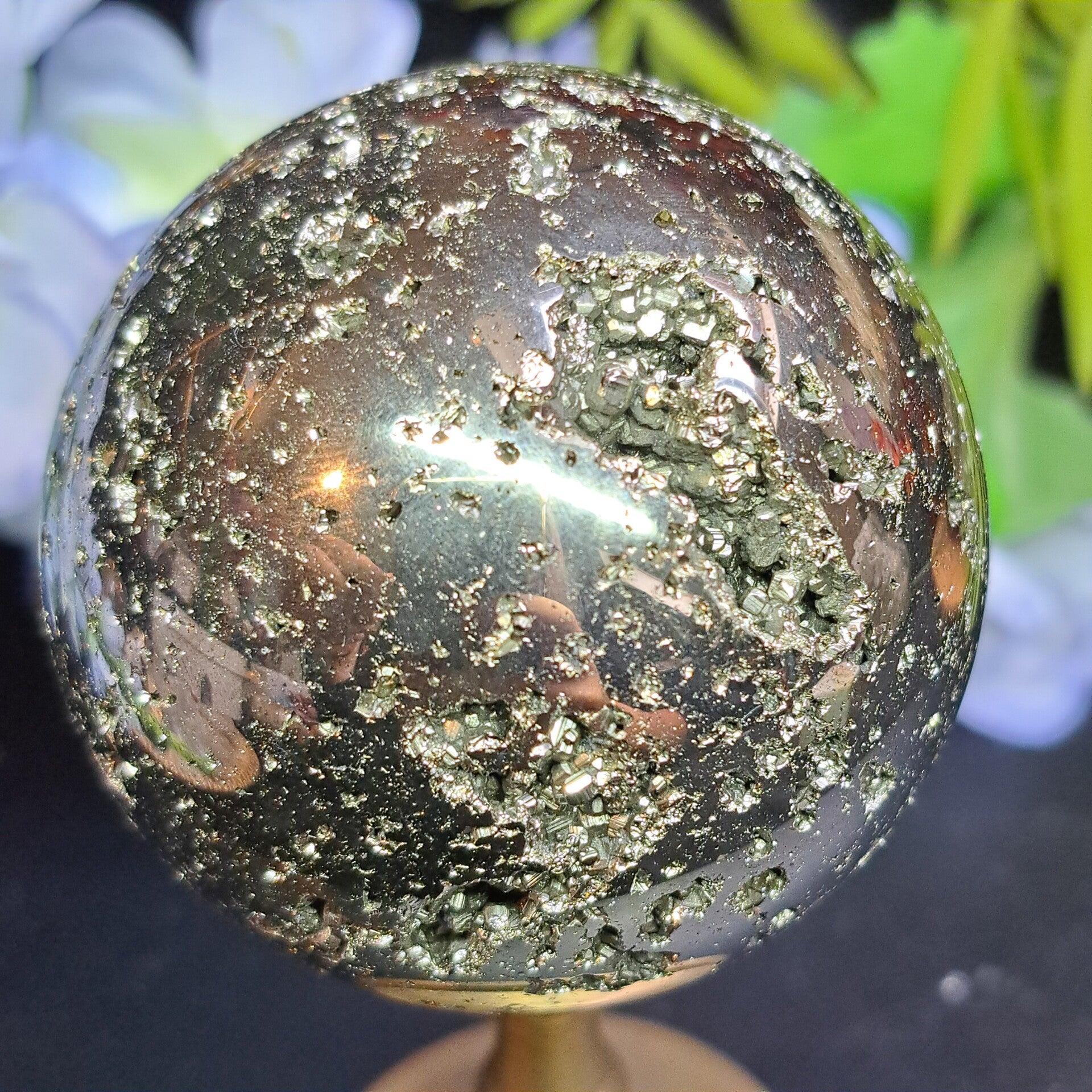 Deze gave glimmende bol met drusy openingen is 400 gram en 5,6 cm groot.