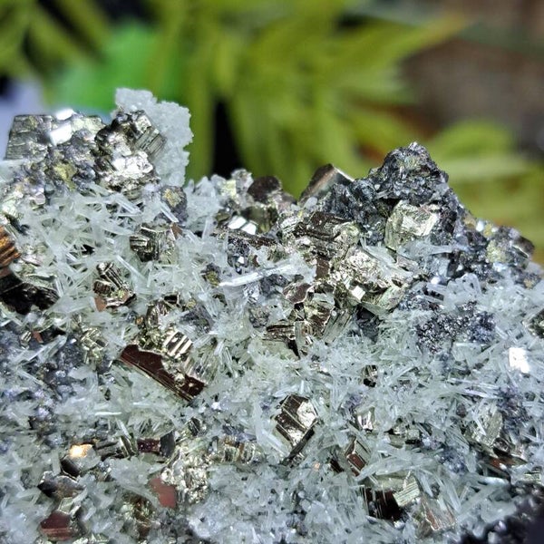 Prachtig gouden glimmend cluster van Pyriet, Naaldkwartskristalletjes en Galeniet en Sfaleriet. Dit clustertje komt uit de Borieva Mijn in Bulgarije en is 195 gram en 10x5cm groot.