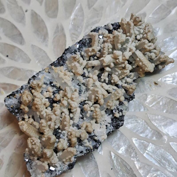 Dit prachtige combinatiecluster van kwarts, gegroeid op sfaleriet en begroeid met Calciet komt uit de Drujba mijn in Bulgarije.