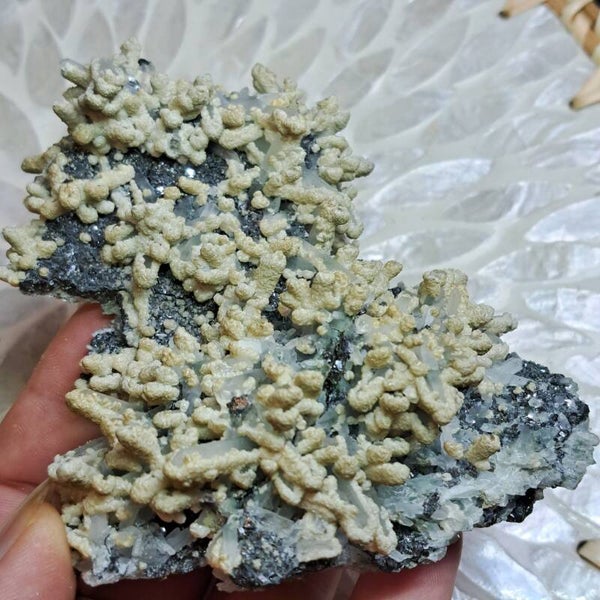 Dit prachtige combinatiecluster van kwarts, gegroeid op sfaleriet en begroeid met Calciet komt uit de Drujba mijn in Bulgarije.