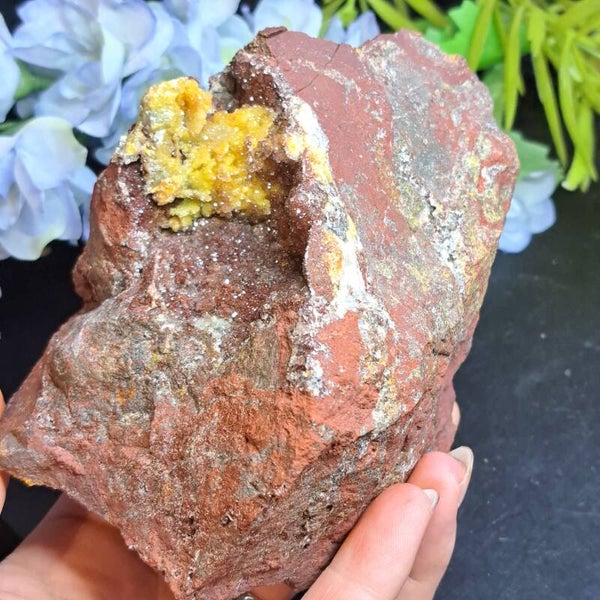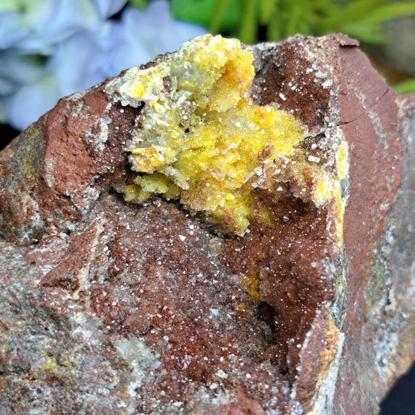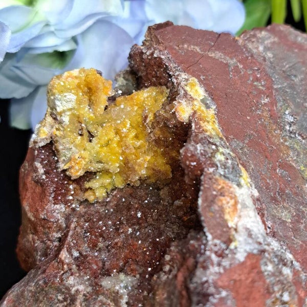 Dit prachtige drusy cluster komt uit de Imini Mijn in Marokko en is een mangaan oxide kwarts met inslutingen van hematiet (rode kleur) en Limoniet (gele kleur).