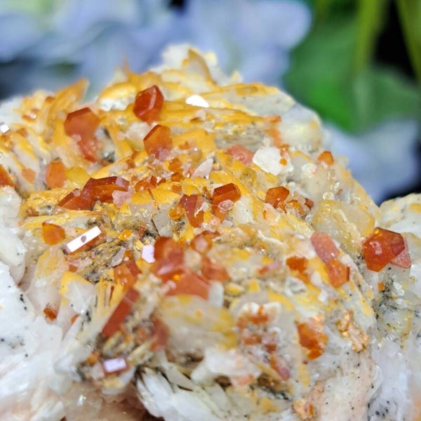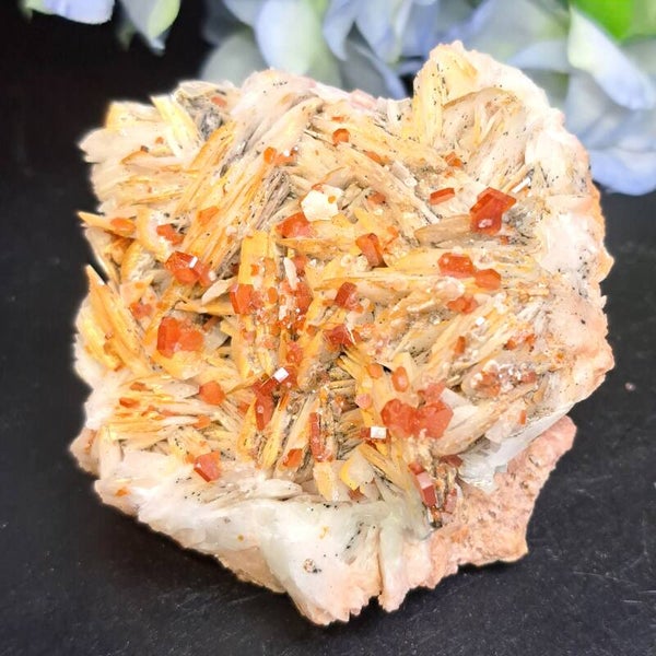 Dit gave combinatiecluser van mooie diep Oranje Vanadiniet kristallen op Bariet komt uit Mibladen Marokko en is 158 gram en 6,5cm groot.