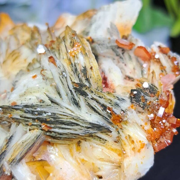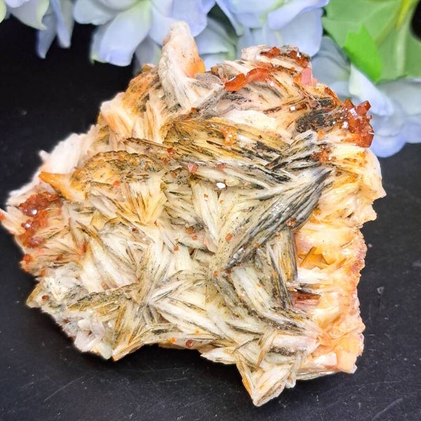 Dit gave combinatiecluser van mooie licht Oranje Vanadiniet kristallen op Bariet komt uit Mibladen Marokko en is 312 gram en 8x9,8cm groot.