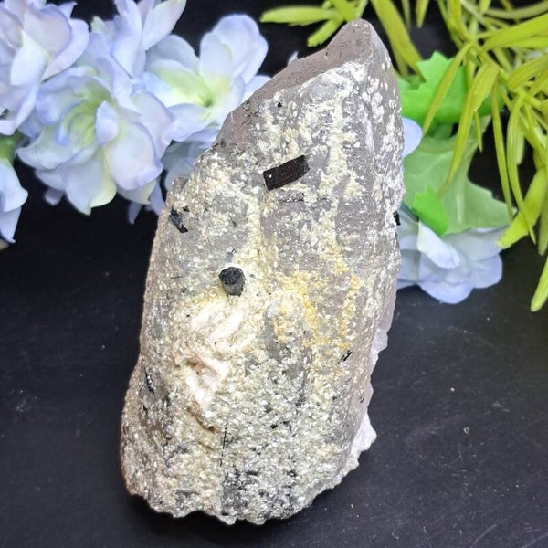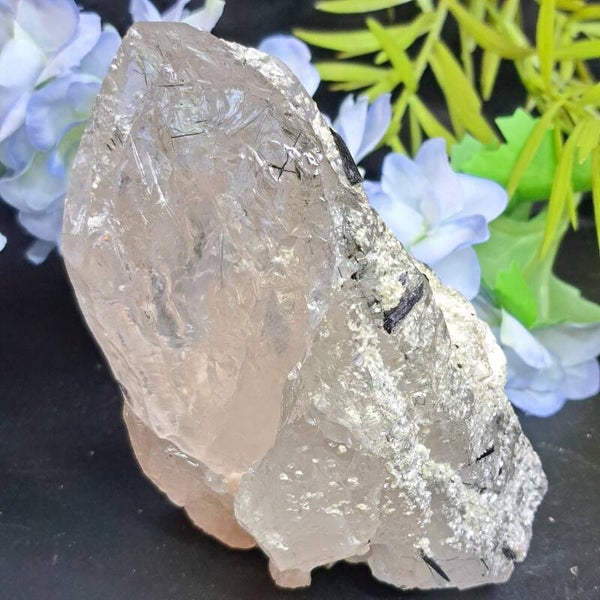 Dit gave ruwe cluster/ Punt met Zwarte Toermalijn, Heldere Kwarts, Mica en Albiet komt uit het Skardu District, Pakistan en is 600 gram en 12,5x8cm groot.