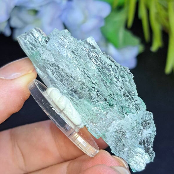 Haliet kan in veel kleuren voorkomen en de kleur is afhankelijk van ingesloten mineralen, in dit geval zorgt Atacamiet voor de groene kleur. Haliet is vanuit de edelsteentherapie een fijne ondersteuner op het gebied van KNO problemen.