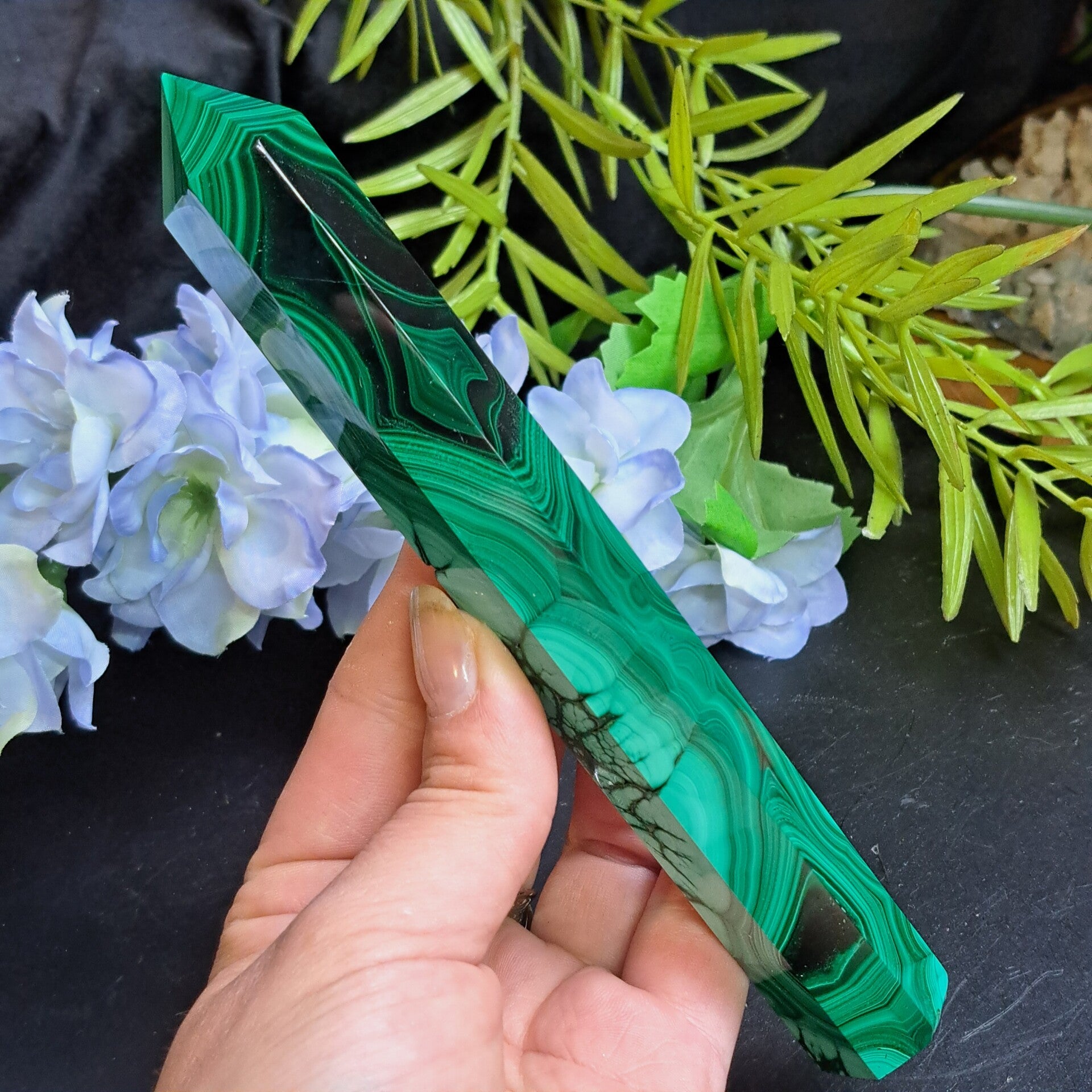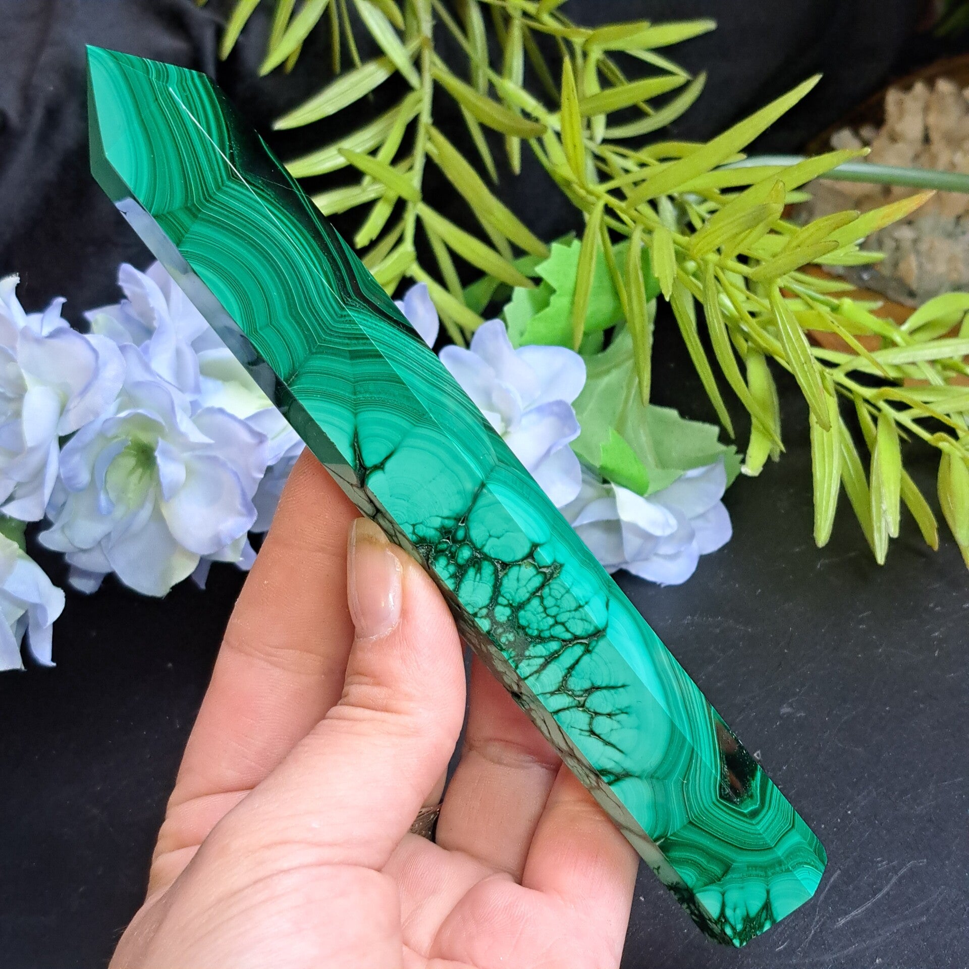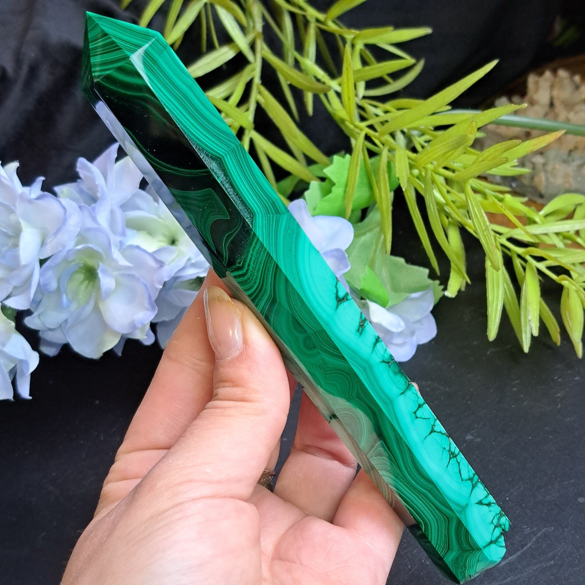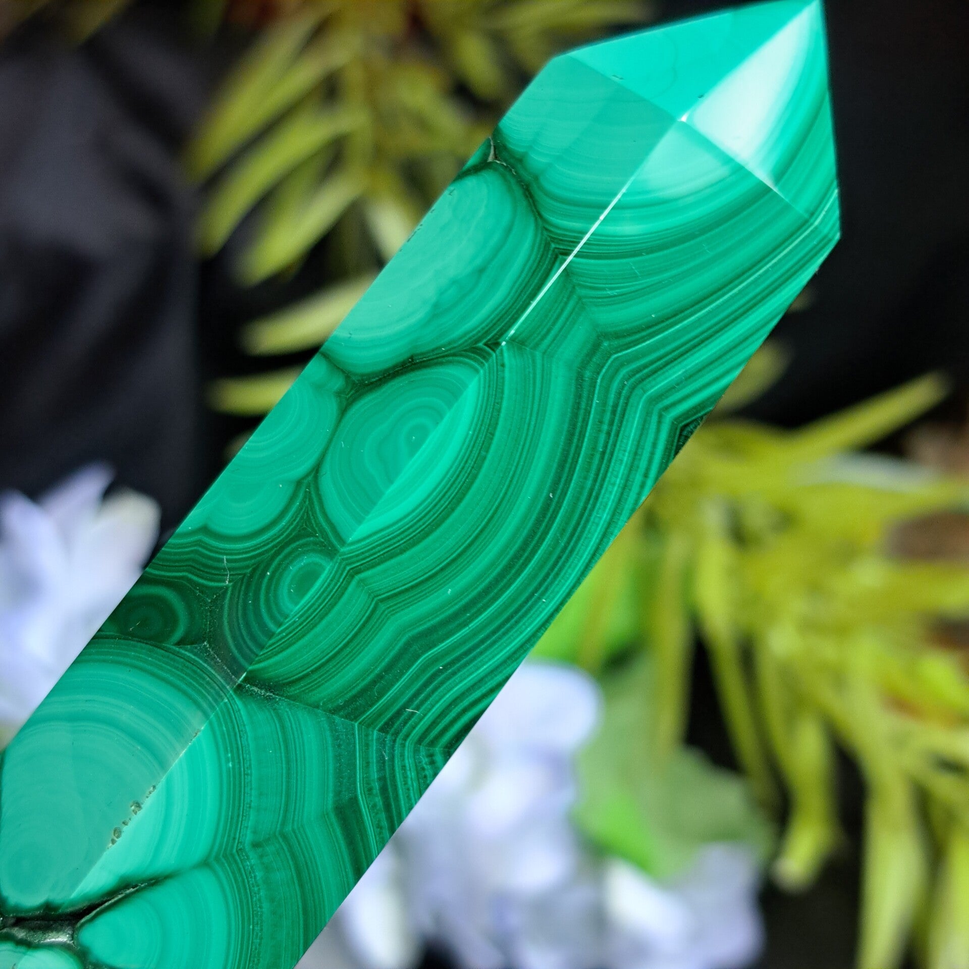 Mooie punt van malachiet met prachtig patroon.
