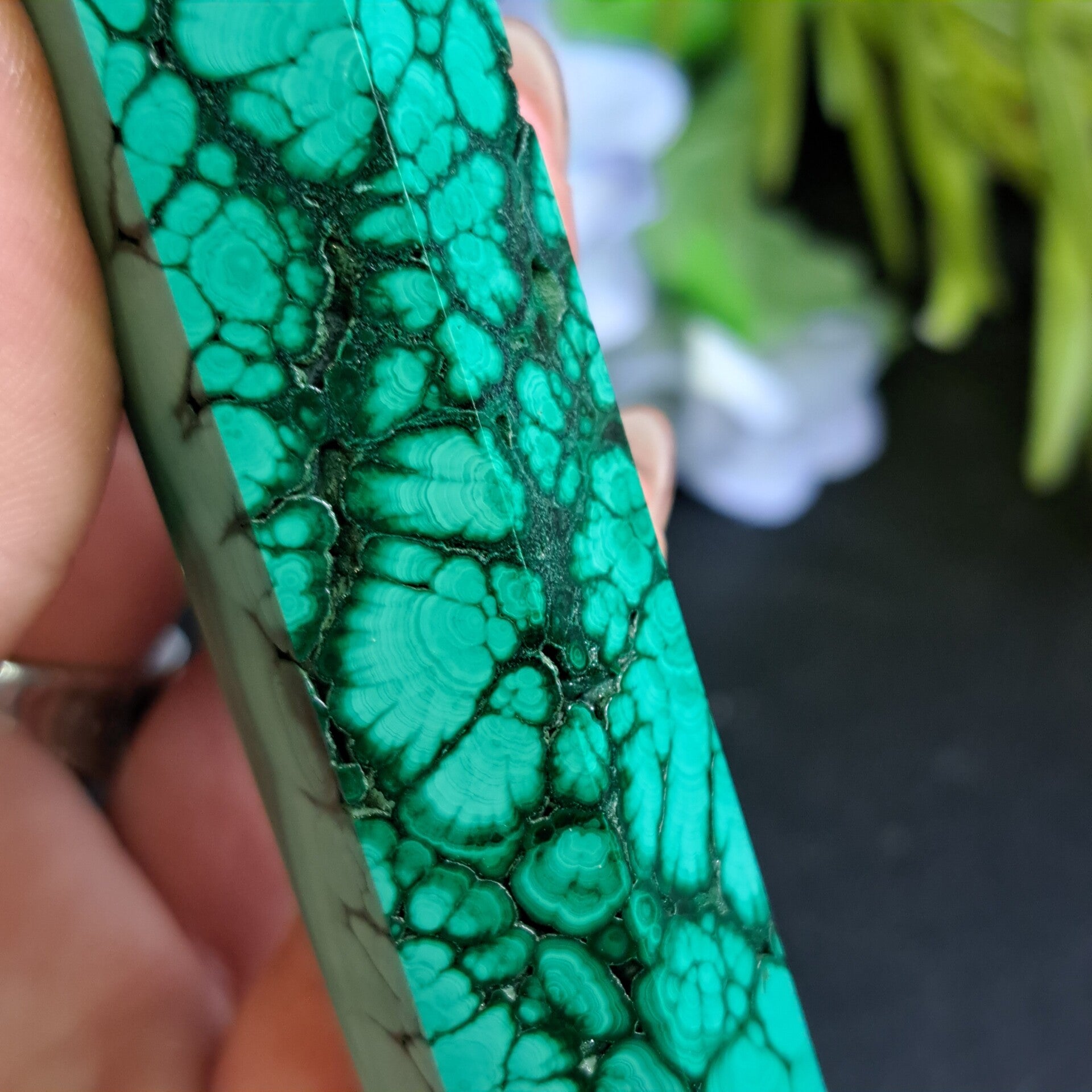 Malachiet is een zacht, snel absorberend mineraal die een hele goede werking heeft op het opzuigen van negatieve energie. Volgens edelsteentherapie helpt het ondersteunend tegen reuma en gewrichtspijnen. Werkt het bloedzuiverend en ondersteunt ze bij menstruatiepijn. Bij astma en oogaandoeningen.
