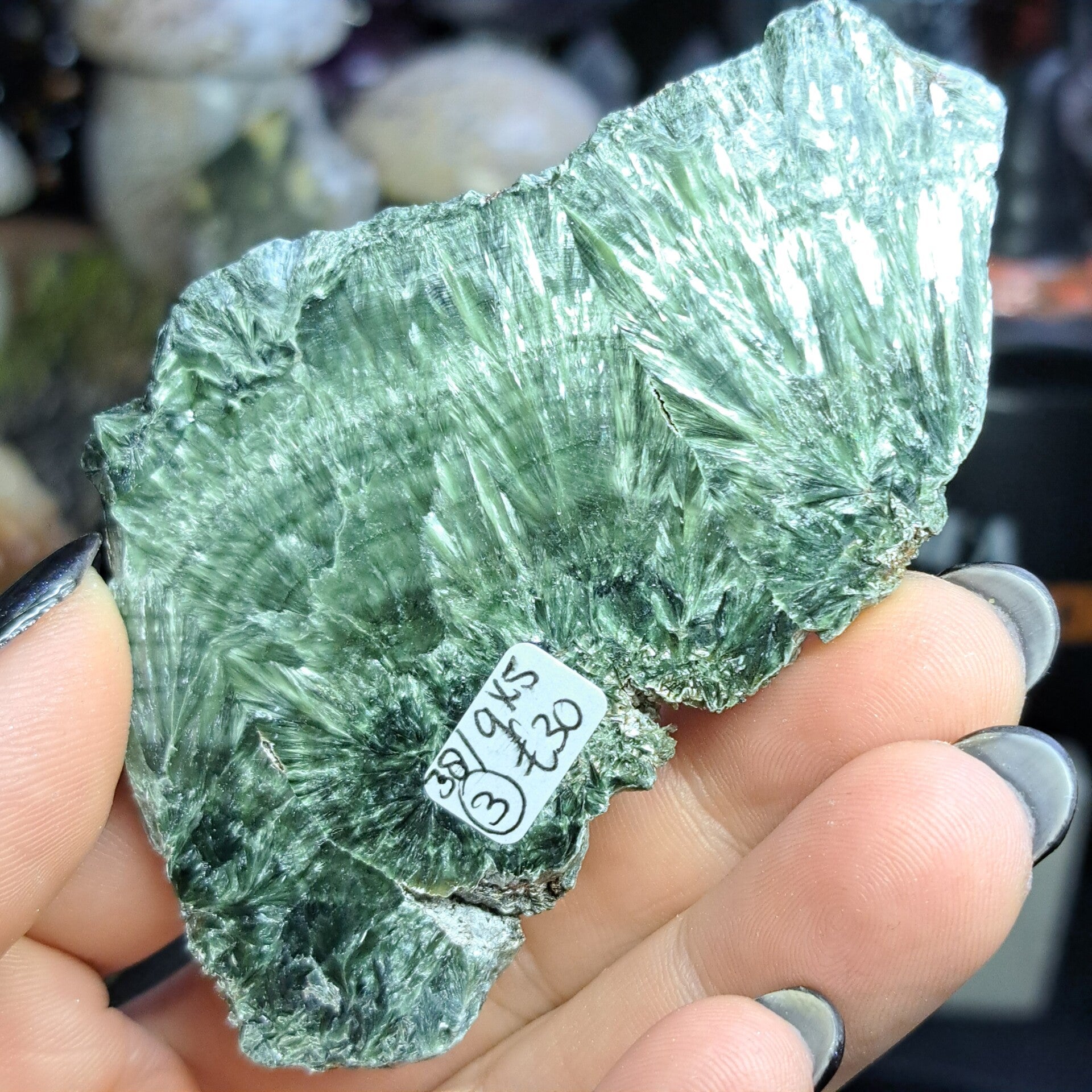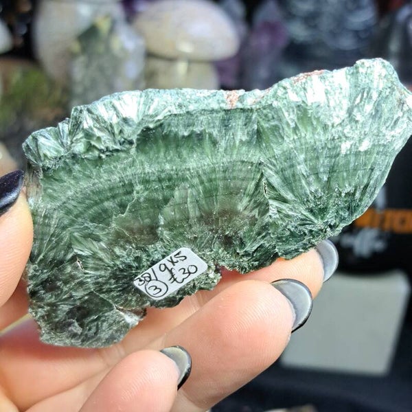 Deze serafiniet plak komt uit Rusland (Korshunovskoye iron deposit, Zehelezenogorsk-Ilimsky, Nizhneilimsky District, Irkutsk Oblast). Is 9x5 cm groot en weegt 38 gram.