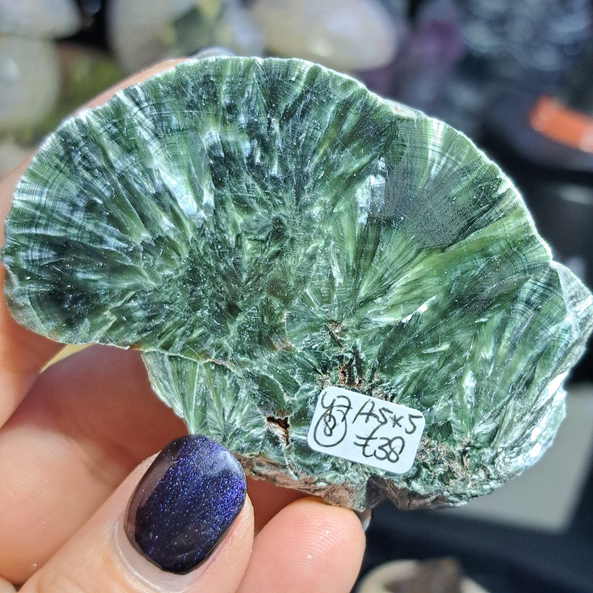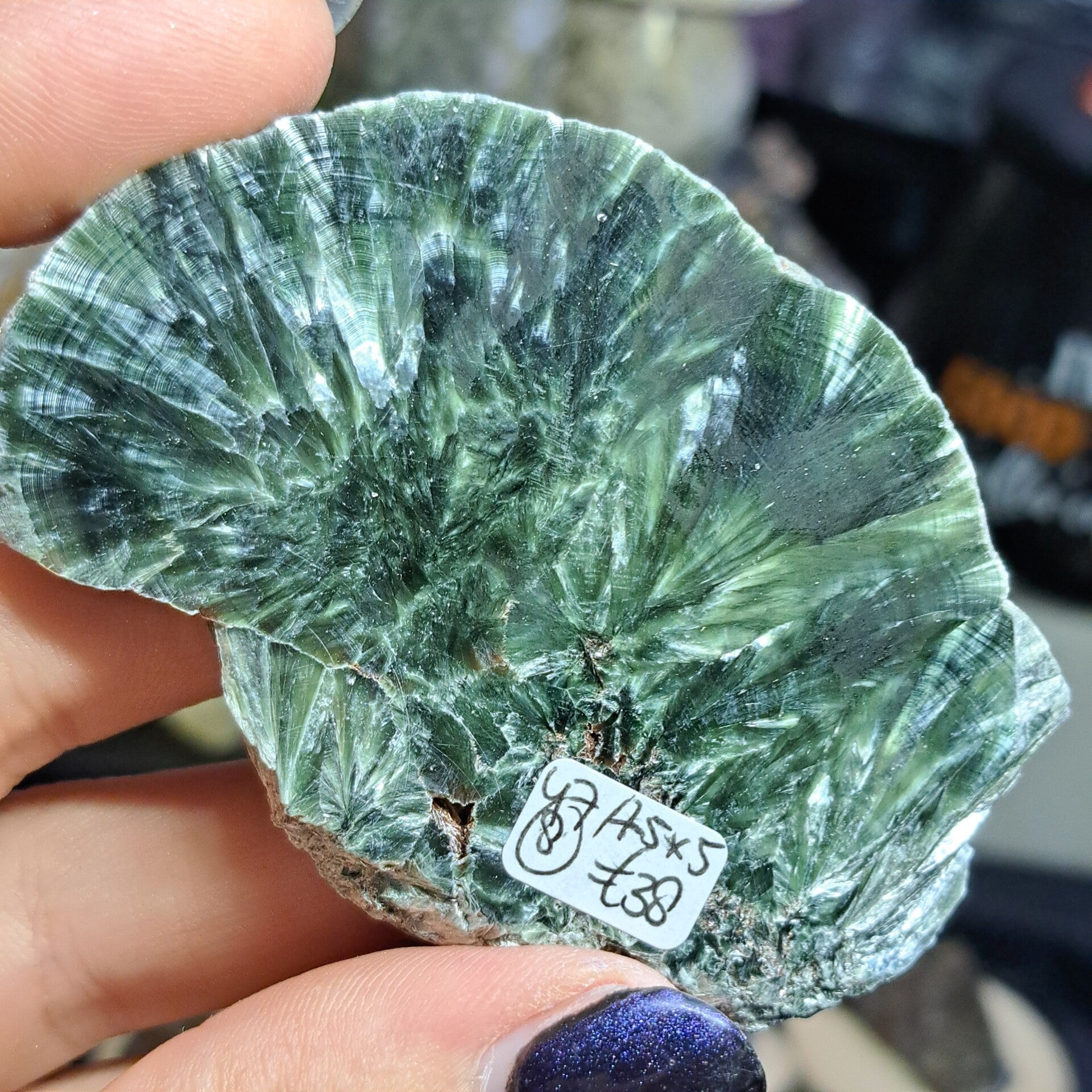 Deze serafiniet plak komt uit Rusland (Korshunovskoye iron deposit, Zehelezenogorsk-Ilimsky, Nizhneilimsky District, Irkutsk Oblast). Is 7,5x5 cm groot en weegt 47 gram.