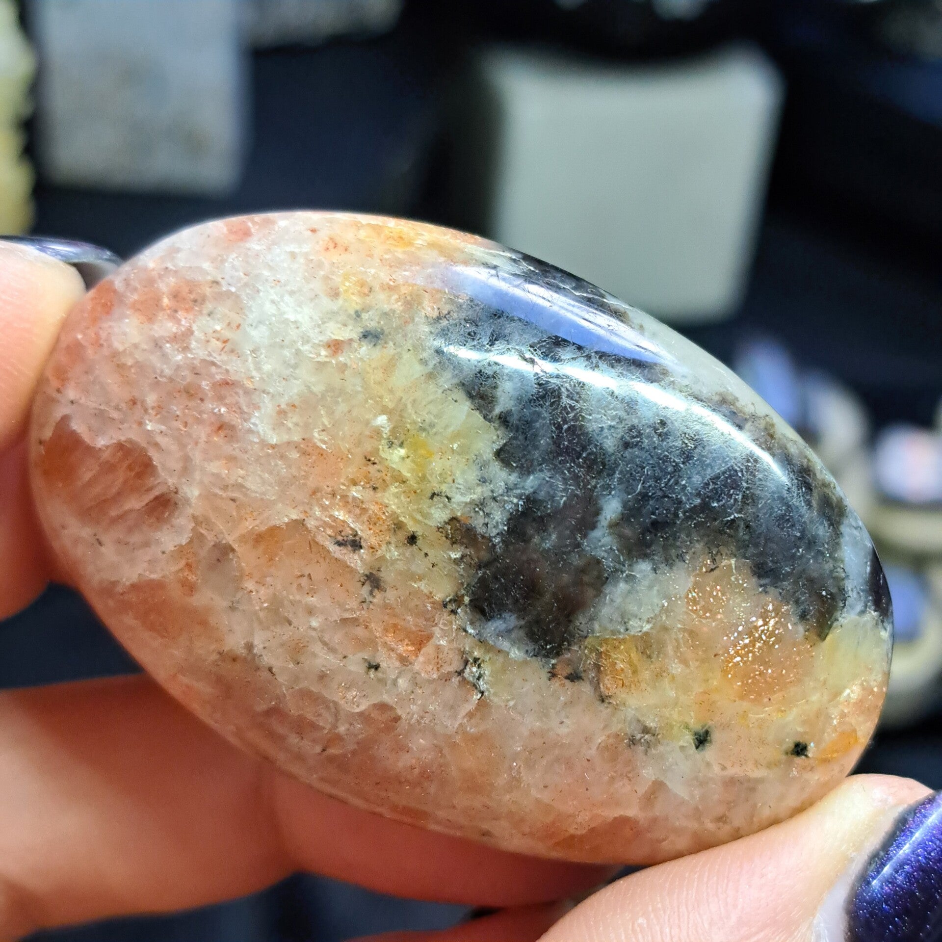 Het blauw en violet zijn afkomstig van titanium- en ijzeronzuiverheden. Tegelijkertijd ontstaan er oranje en gouden tinten door de aanwezigheid van goethiet of hematiet.