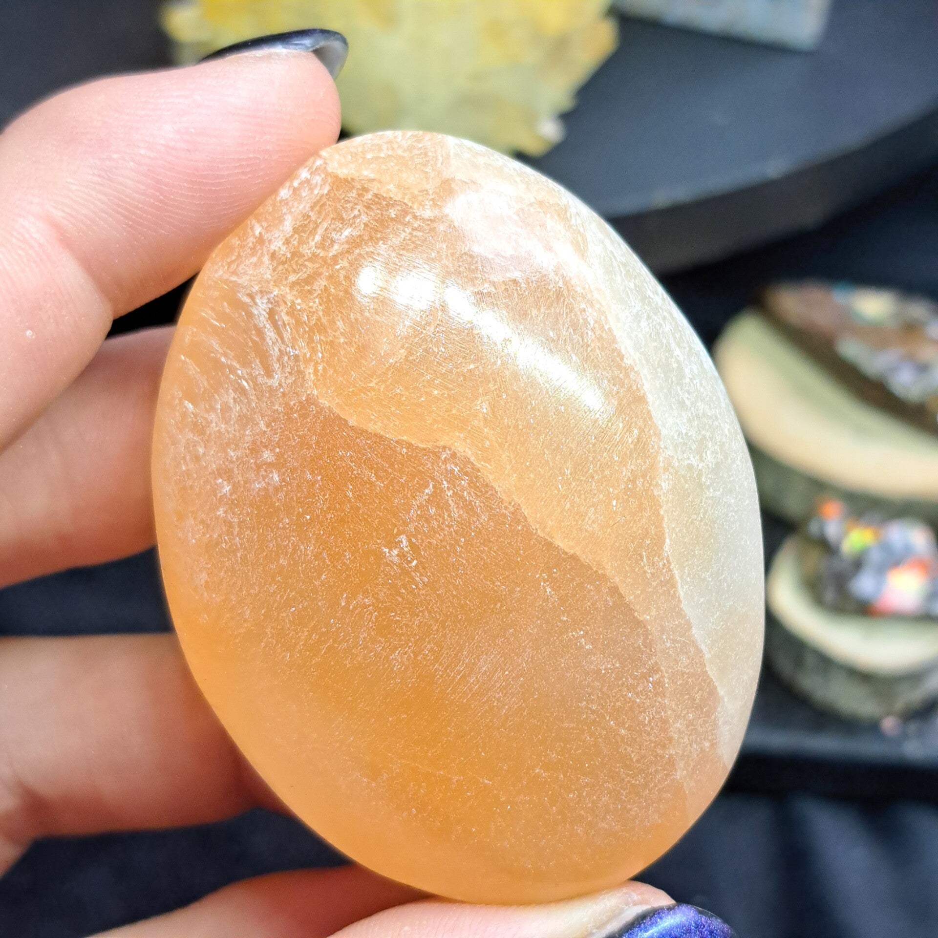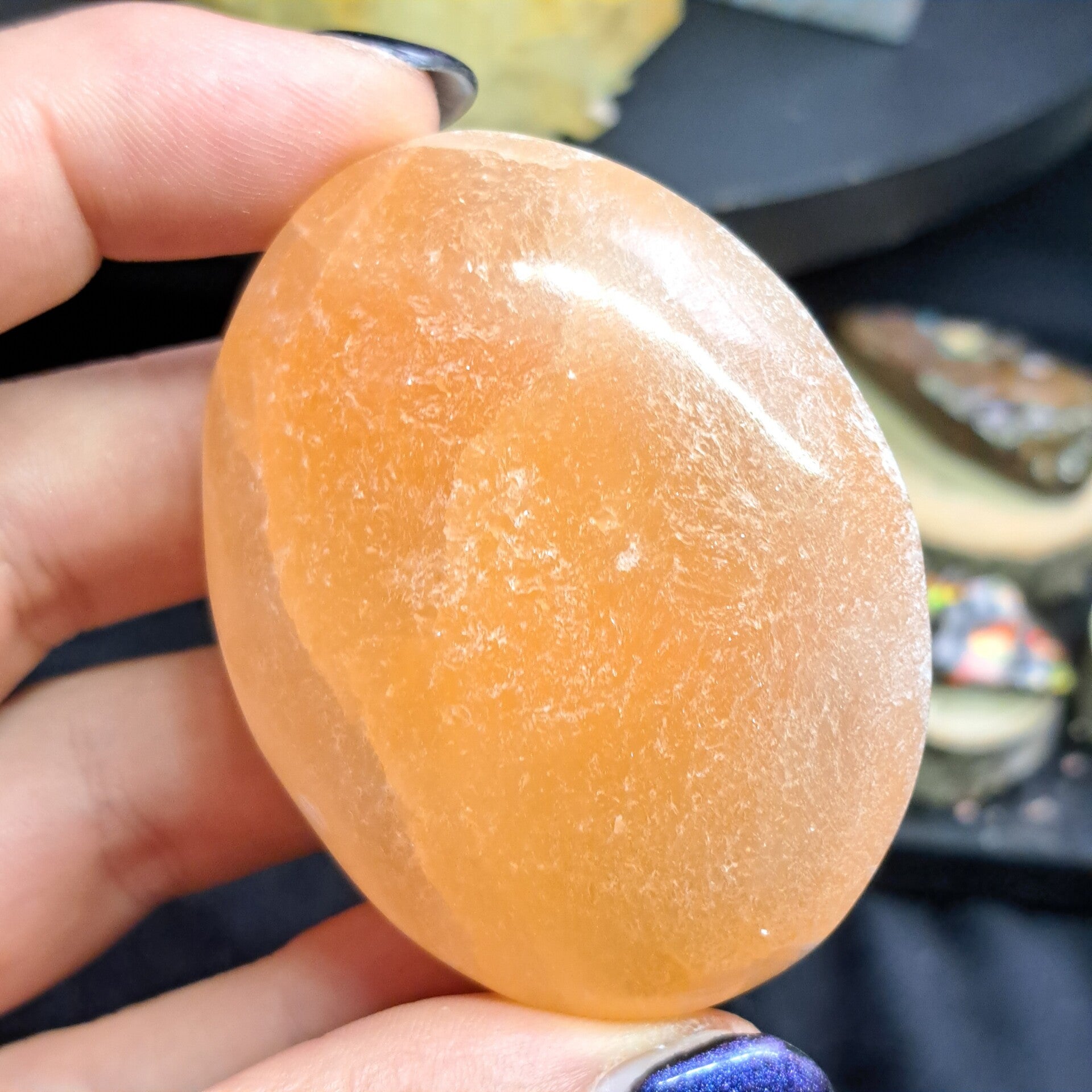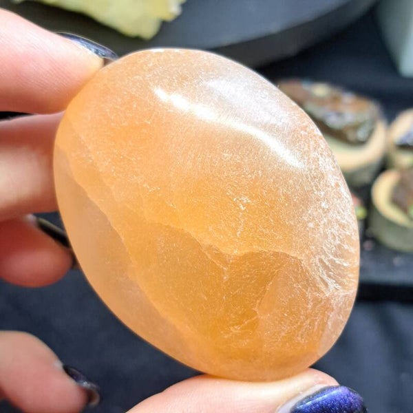 Deze mooie palmsteen van oranje satijnspaat dankt haar mooie natuurlijke kleur aan oxidaties van ijzer en is ongeveer 6,5 cm groot.
