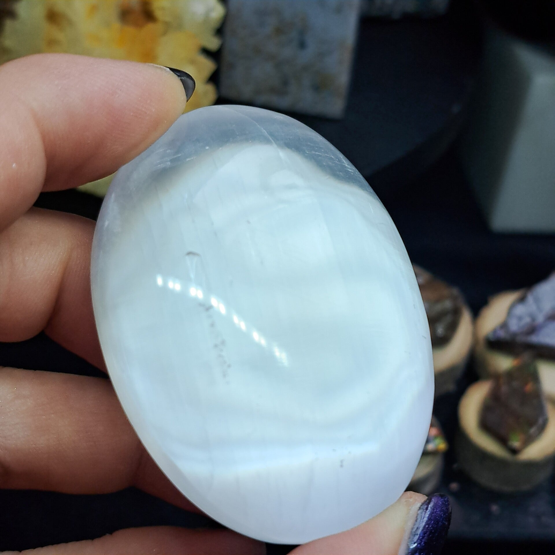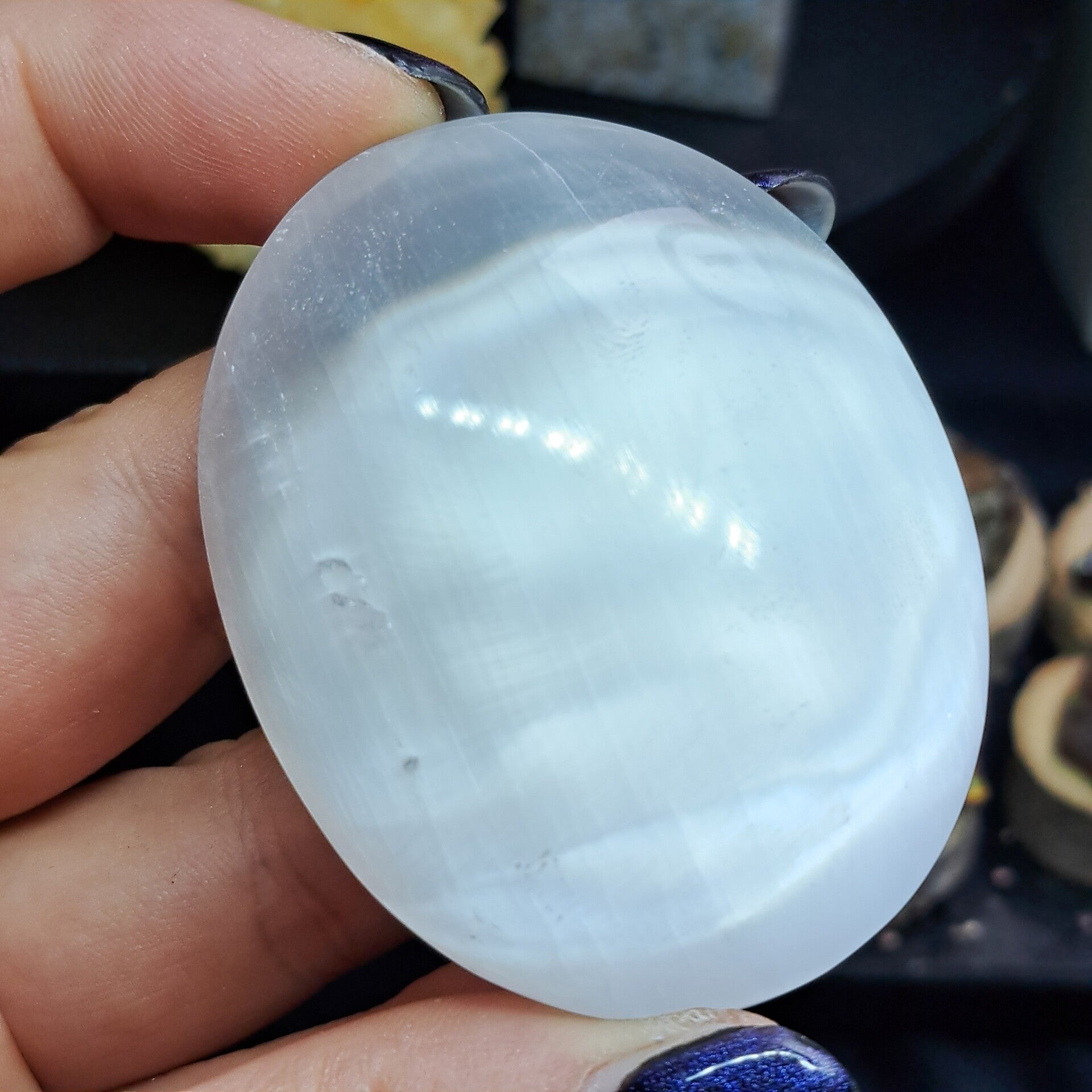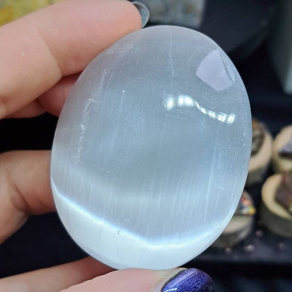 Deze mooie palmsteen van satijnspaat (Seleniet) is ongeveer 6,5 cm groot.