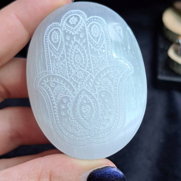 Deze mooie palmsteen van satijnspaat met eenzijdig ingegraveerde Hamsa Hand is ongeveer 6,5 cm groot.