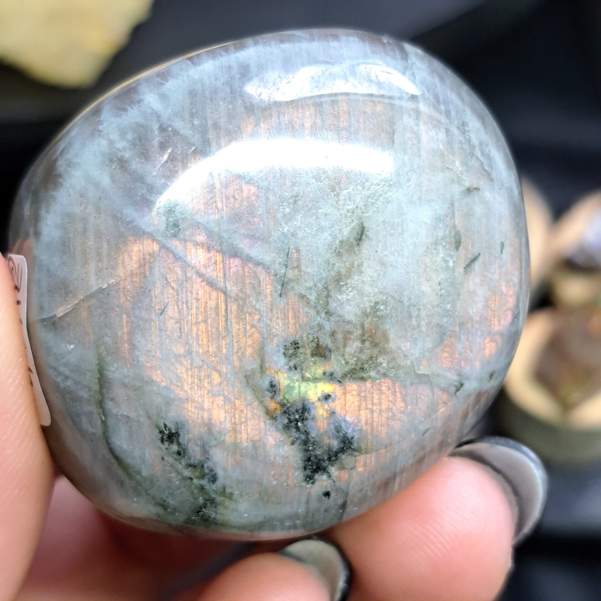 Deze flashy labradoriet jumbo is 71 gram en 4,6cm groot.