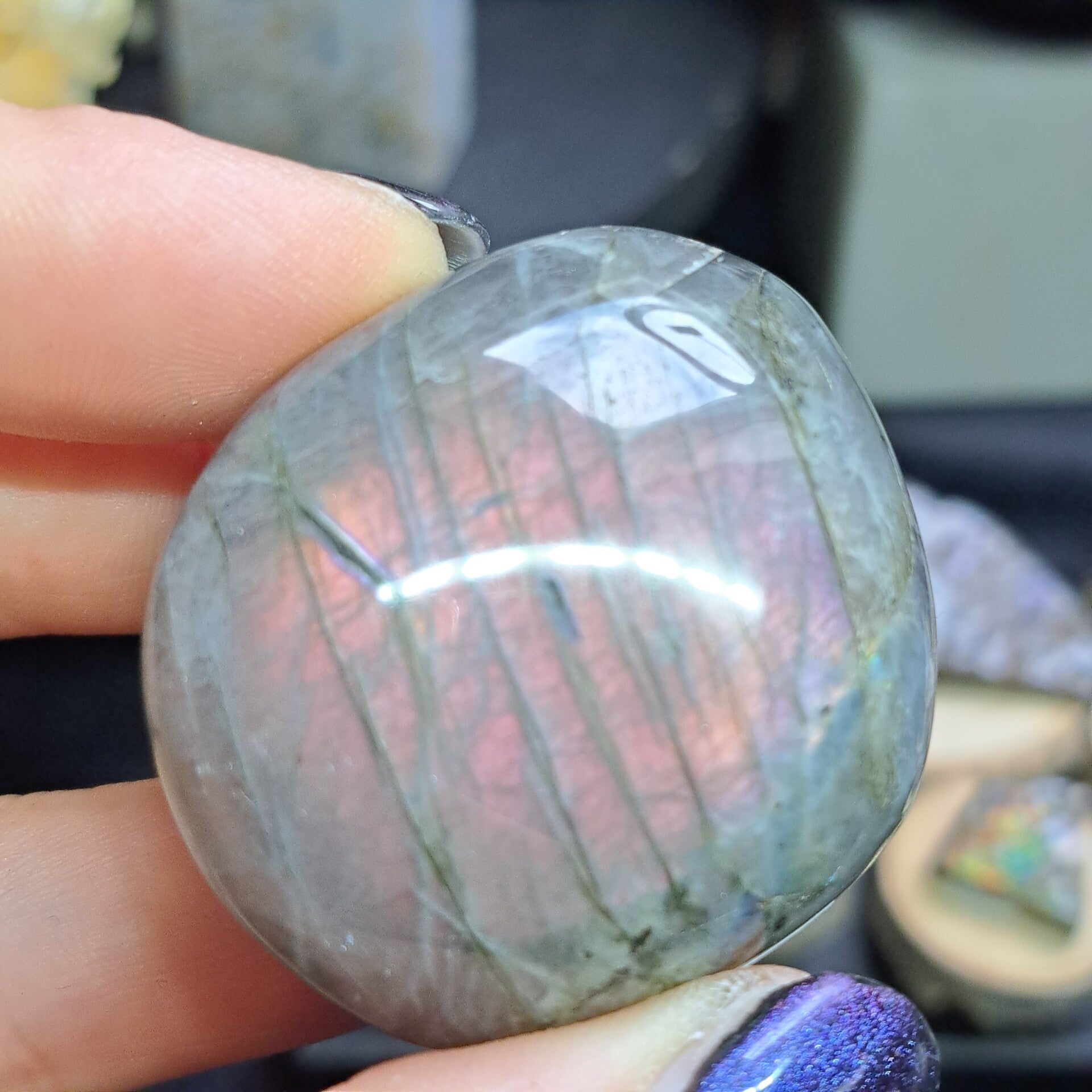 Labradoriet is een sterk iriserende steen die in alle mogelijke kleuren uit het lichtspectrum op kan lichten. Door het draaien van de steen kom je iedere keer weer nieuwe patronen, kleuren en wereldjes tegen.