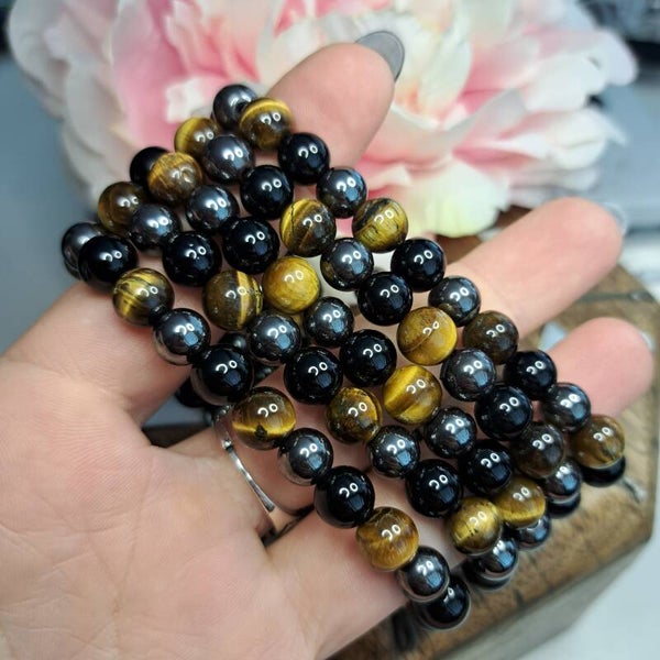 Gave elastische mix armband met een kraal van 8mm.Deze armband heeft een combinatie van Hematiet, Tijgeroog en Obsidiaan en staat symbool voor bescherming, gronding en balans.