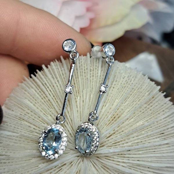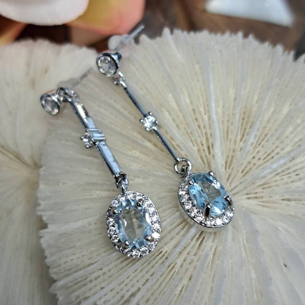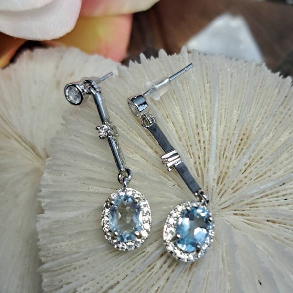 Deze mooie oorbellen zijn van S925 zilver, hebben een facetgeslepen aquamarijntje en rondom gezet met moissaniet diamantjes. Ze zijn 3,5 cm lang.