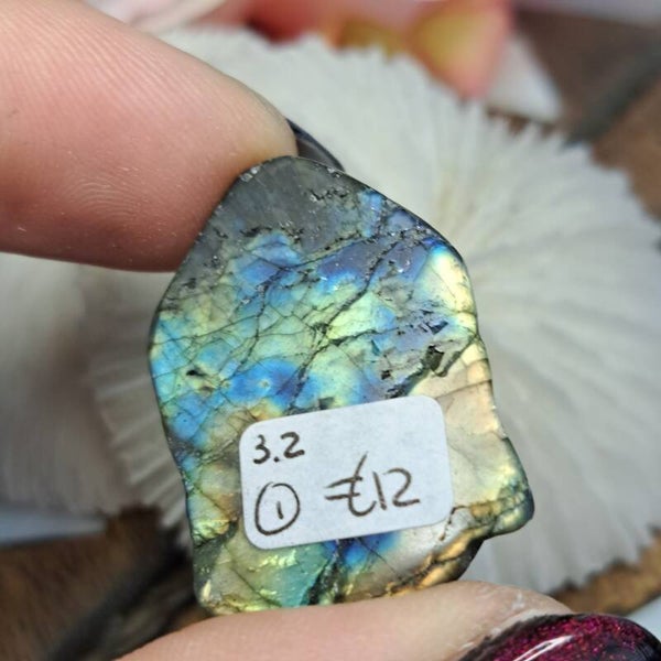 Labradoriet is een sterk iriserende steen die in alle mogelijke kleuren uit het lichtspectrum op kan lichten. Door het draaien van de steen kom je iedere keer weer nieuwe patronen, kleuren en wereldjes tegen.