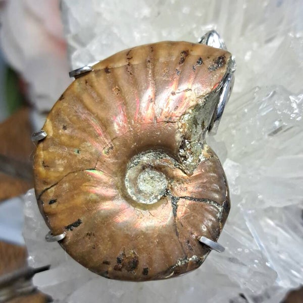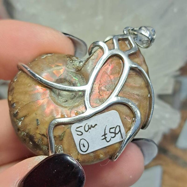 Deze prachtige ammoniet hanger met iriserende glans is gezet in S925 zilver en is 5cm groot.