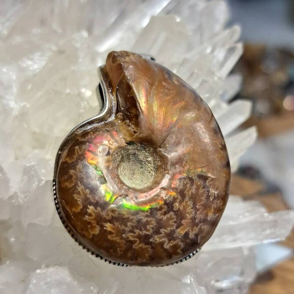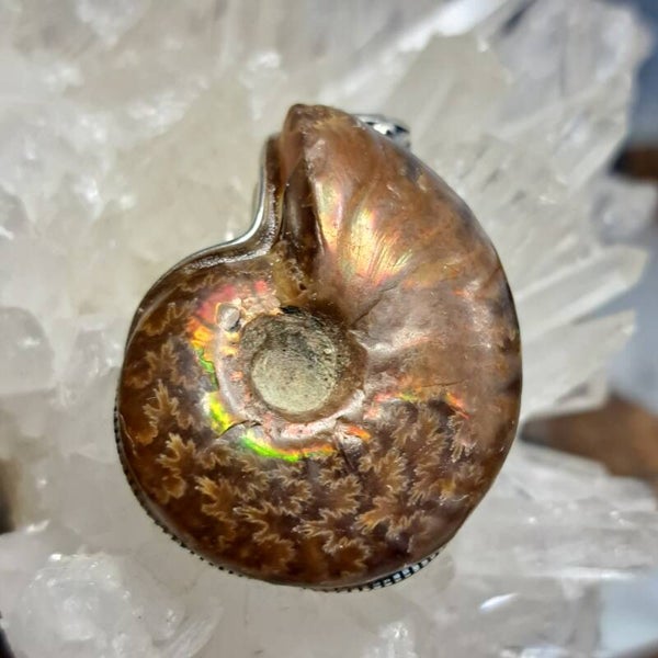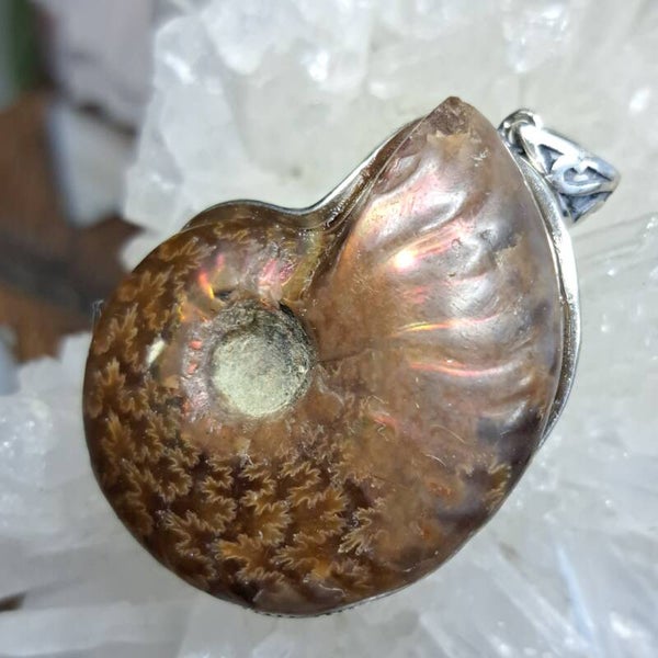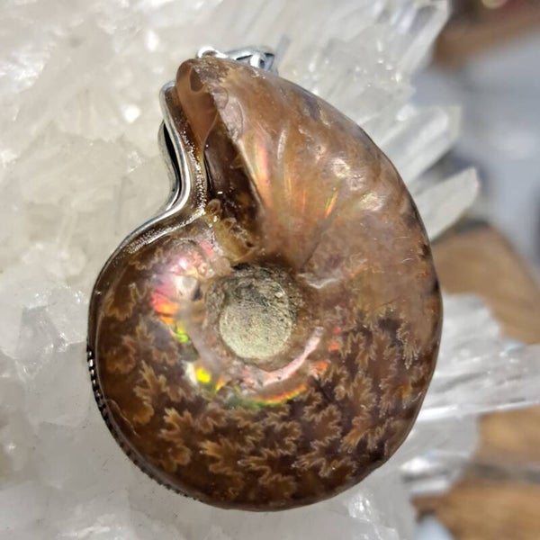 Deze prachtige ammoniet hanger met iriserende glans is gezet in S925 zilver en is 4cm groot.