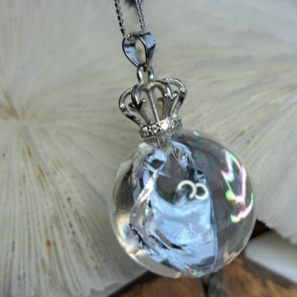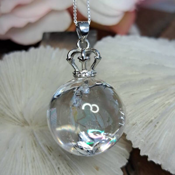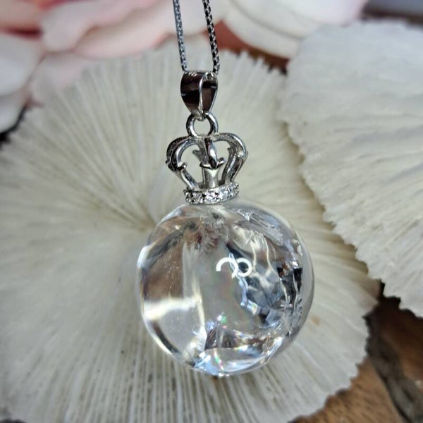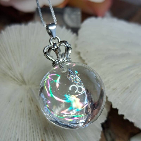 Deze toffe hanger met kwartsbolletje vol regenboogjes hangt aan een kroontje van S925 zilver welke ook is voorzien van een aantal moissaniet diamantjes. De hanger is totaal 3 cm groot.