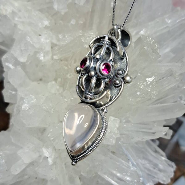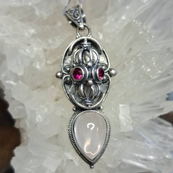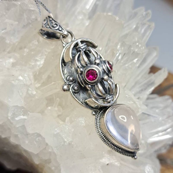 Deze gave hanger van S925 zilver met een beweegbare en draaibare Dorje heeft 4 robijntjes en een lichte ster rozenkwarts steen eronder. De hanger is totaal 5cm lang.