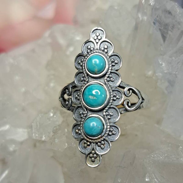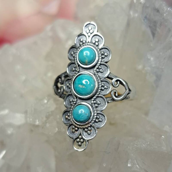 Deze mooie ring van S925 zilver voorzien van drie turquoise steentjes (Hubei China), is verstelbaar en draagbaar van maat 18 tot maat 20.