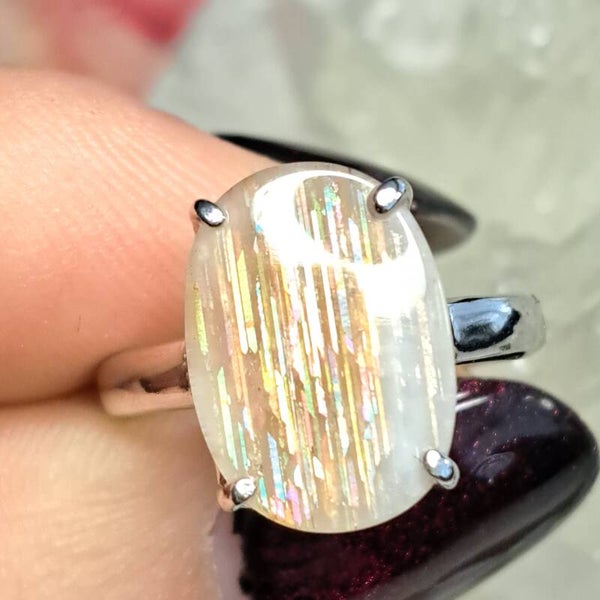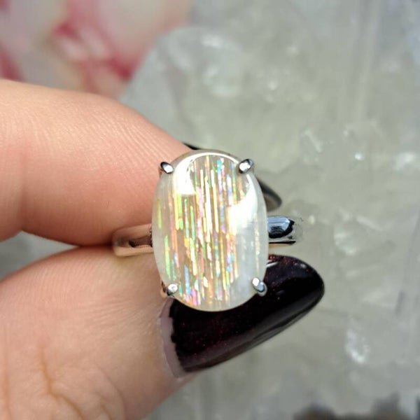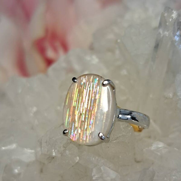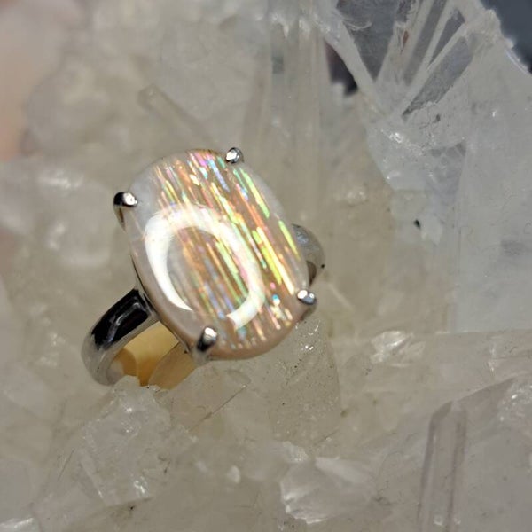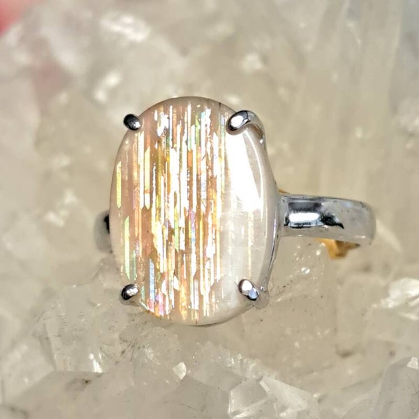 Deze mooie S925 zilveren ring met Zonnesteen vol "Meteorite shower" flash (Australie) is gesloten aan de onderzijde en NIET verstelbaar! Maat 17.