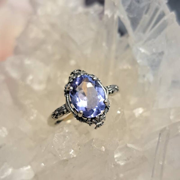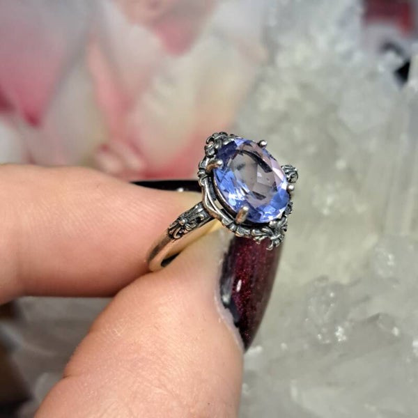 Deze prachtige ring met facetgeslepen ovale saffier is gezet in S925 zilver, heeft standaard maat 17,5 en is verstelbaar. Draagbaar van maat 17 tot maat 18.