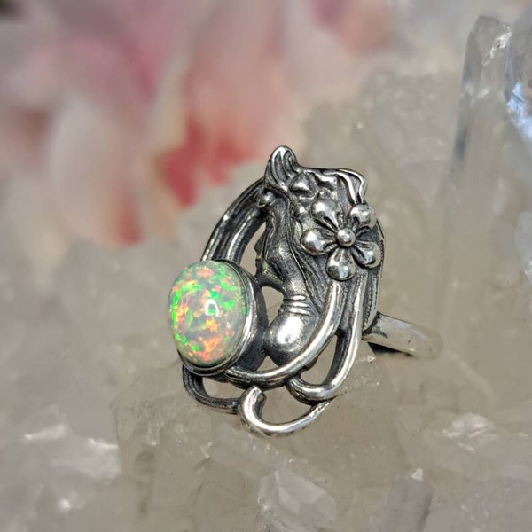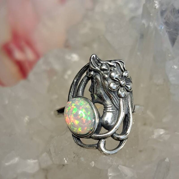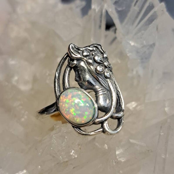 Gezet in een S925 zilveren ring met Art Deco Dame heeft deze prachtige Opaal fantastische kleurrijke flash!
